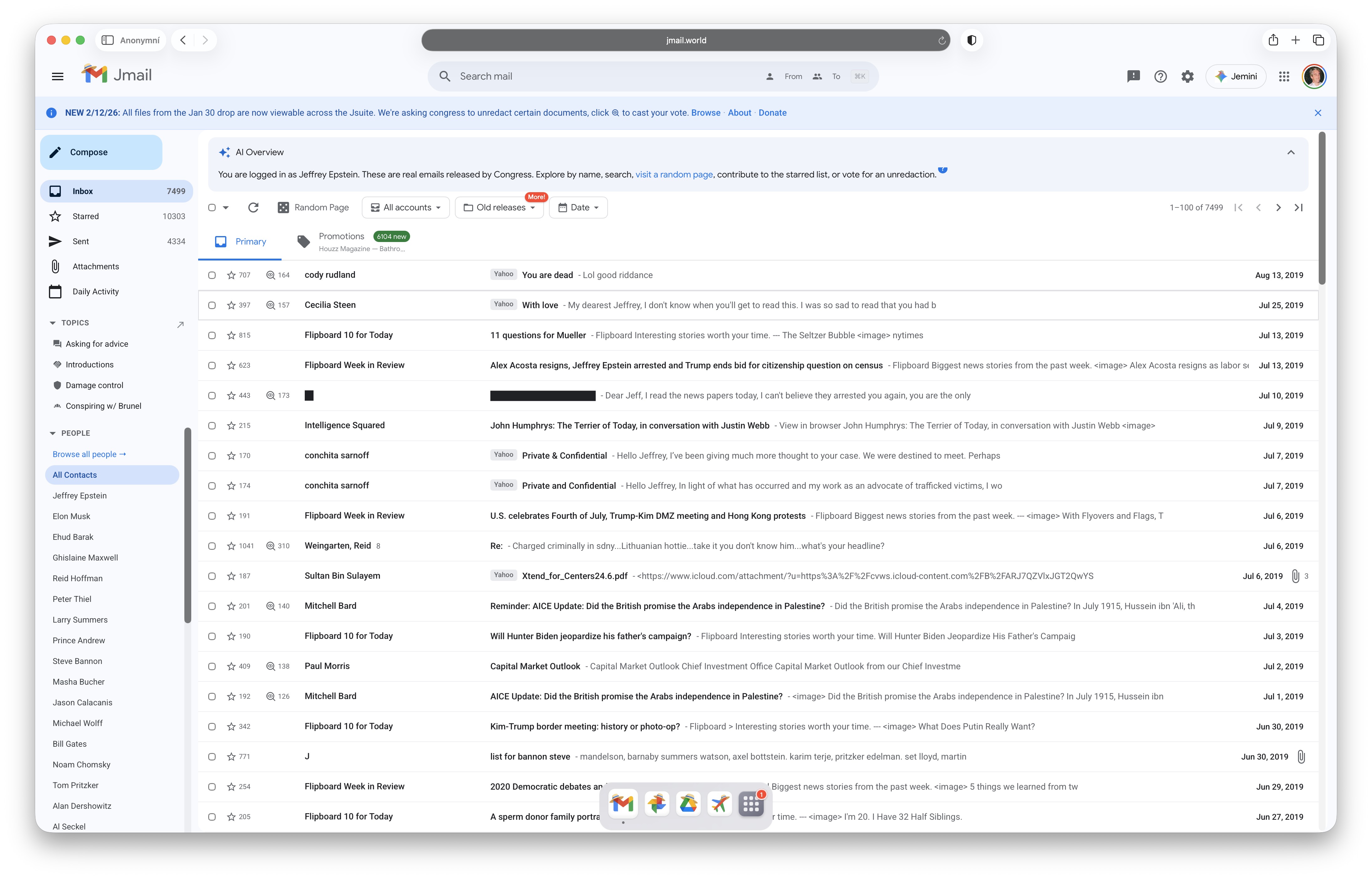 Jde konkrétně o zajímavý internetový nástroj, za kterým stojí umělec Riley Walz a vývojář Luke Igel. Jmail je de facto prohlížeč zveřejněných dokumentů v kabátu, který je většině lidí důvěrně známý. Inspiraci si totiž bere z rozhraní Google Gmailu. Spisy si můžete procházet tak, jako byste otevřeli vlastní e-mailovou schránku.