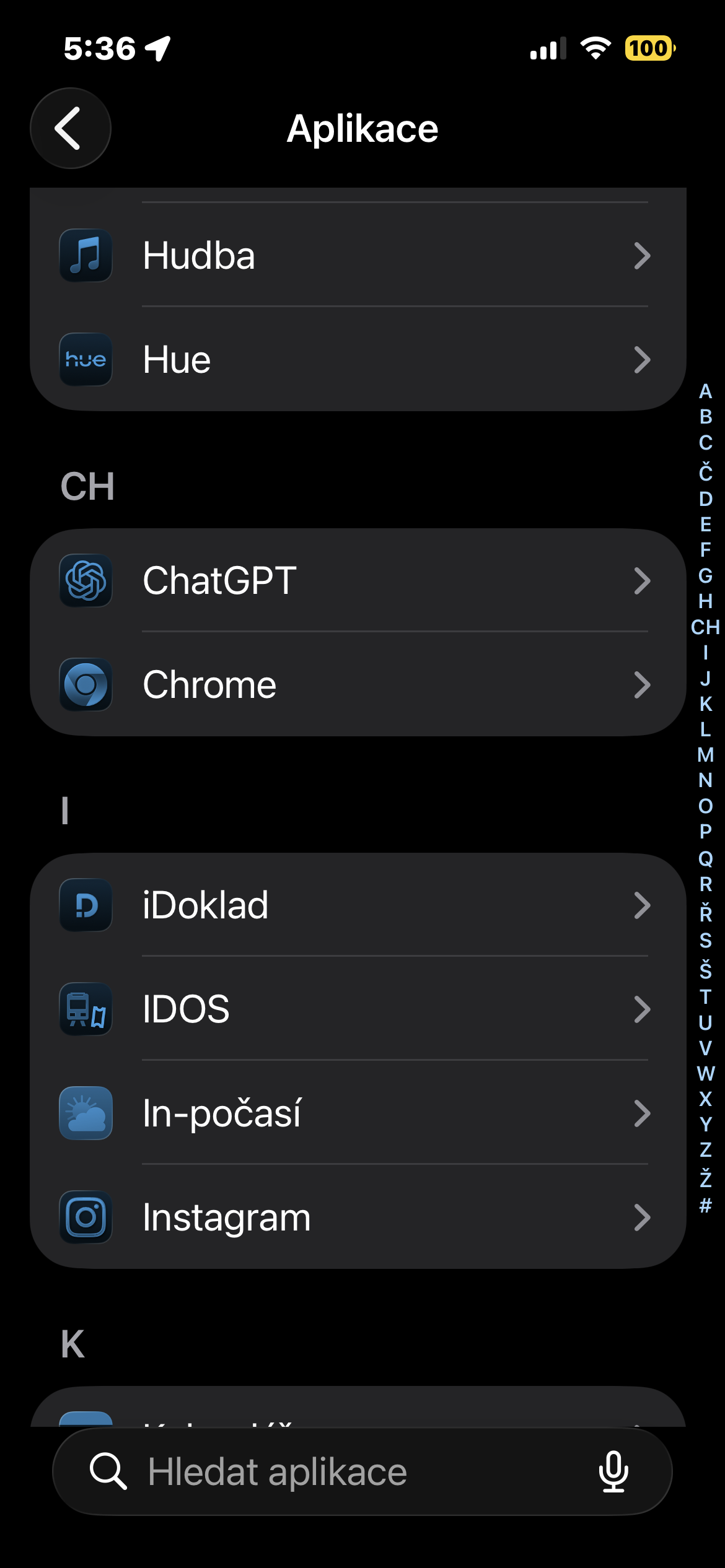 • Sjeďte dolů do seznamu aplikací a klepněte na Hudba.