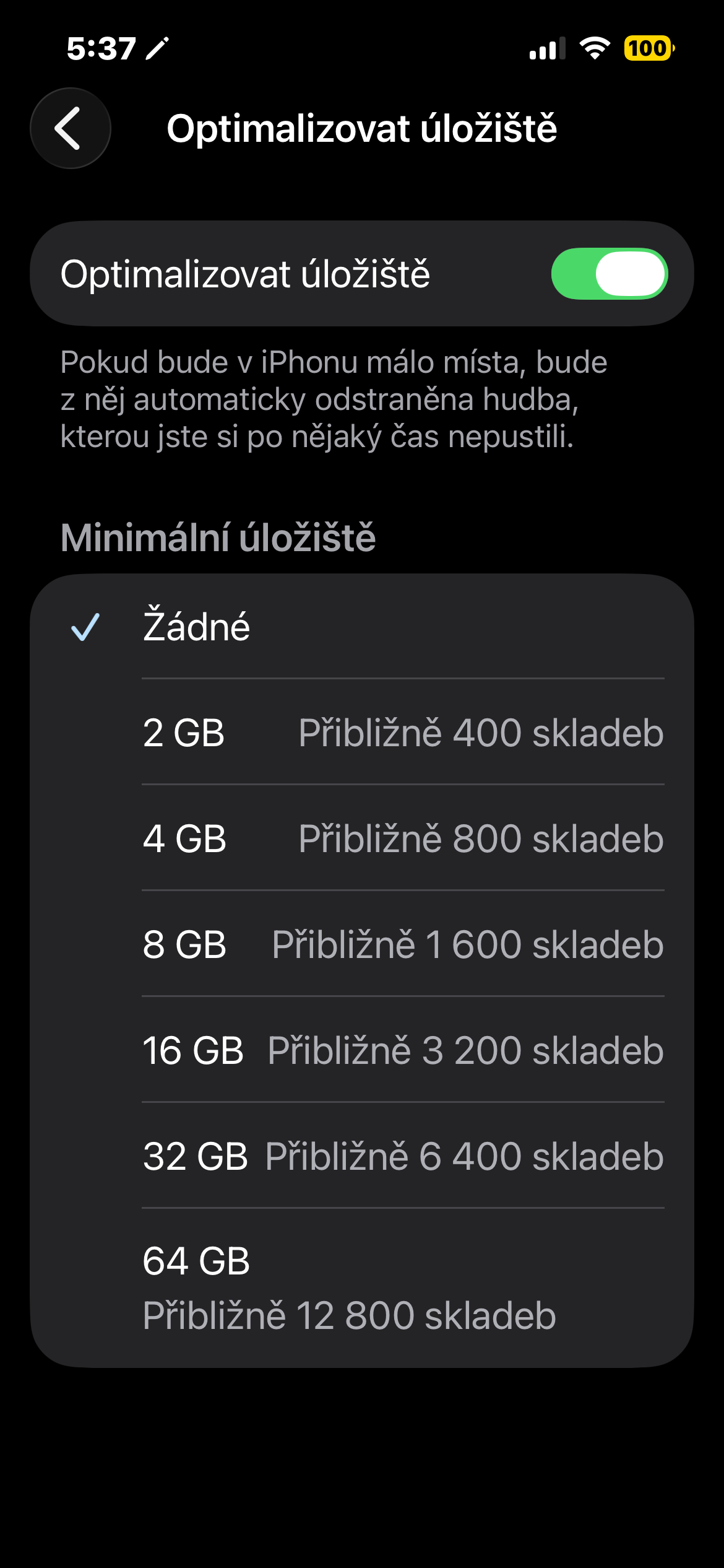 Optimalizované úložiště. Ta se aktivuje ve chvíli, kdy začne být na zařízení málo volného místa, a automaticky odstraní stažené skladby, které jste delší dobu neposlouchali. Novější nebo často přehrávaná hudba zůstane zachována.