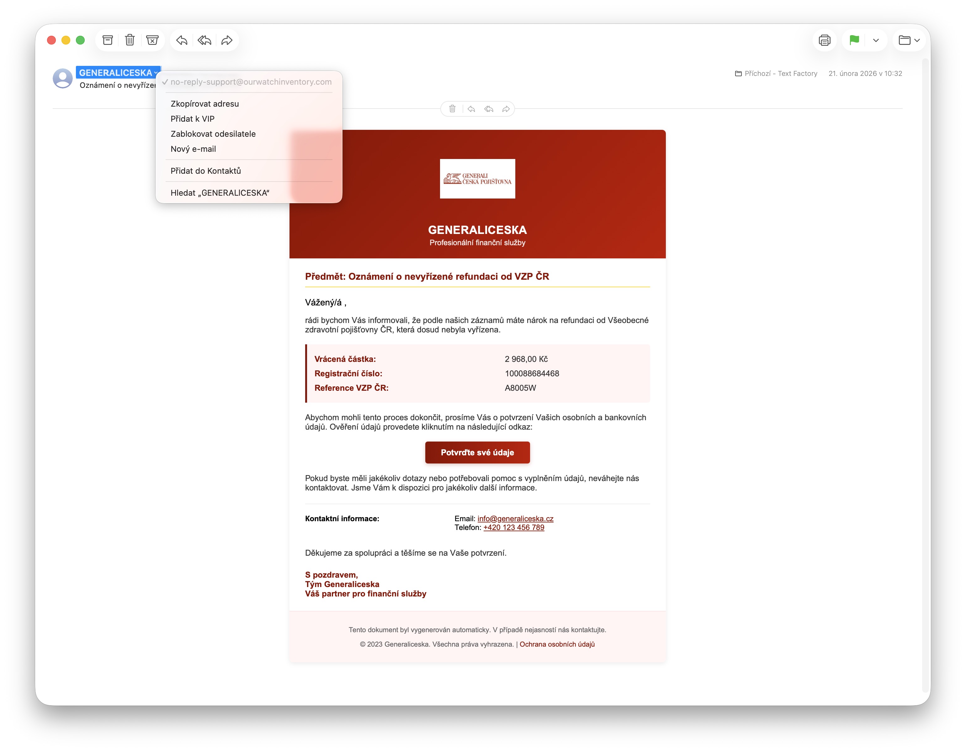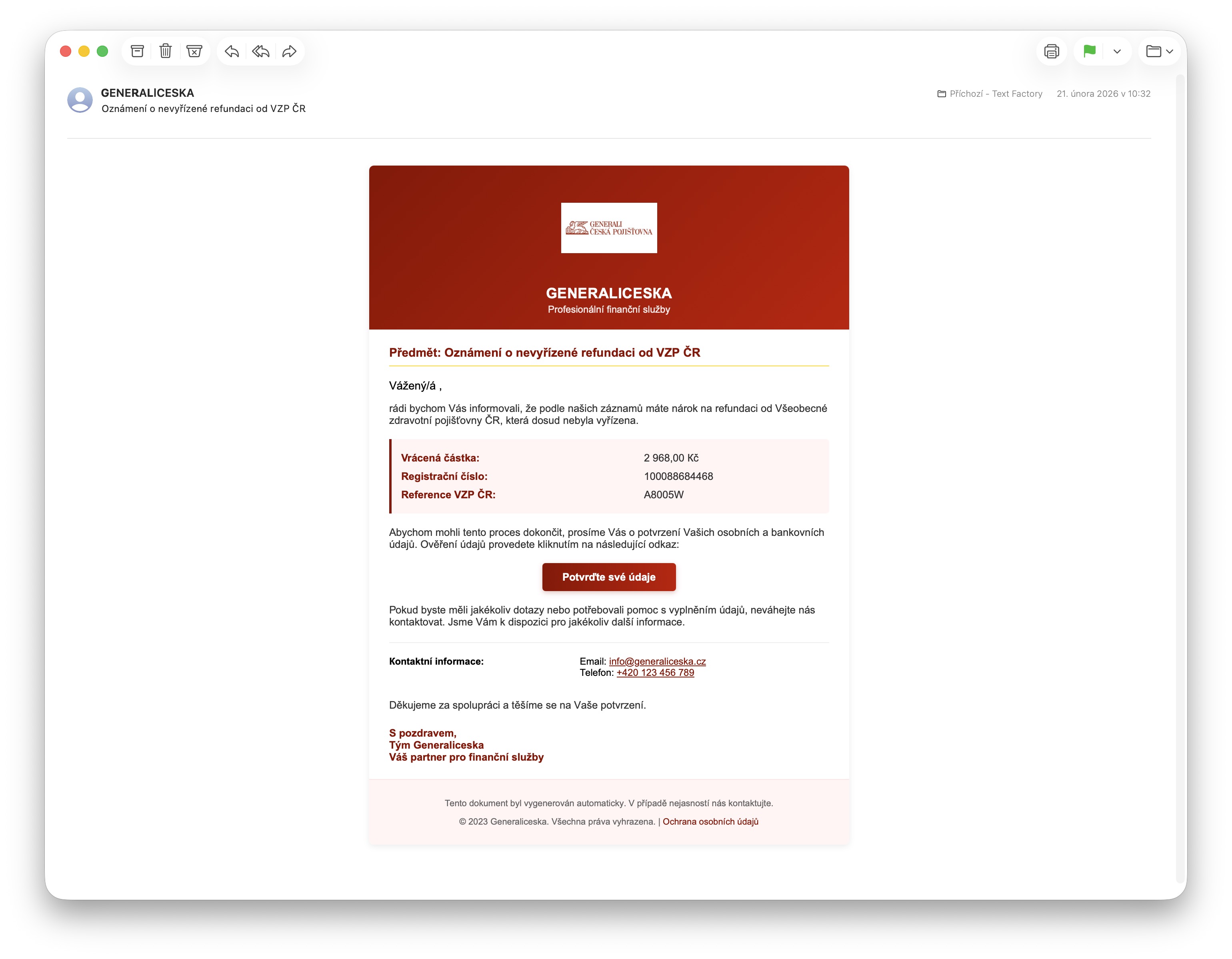 Internetové podvody v České republice neberou konce, ba právě naopak v posledních měsících jejich intenzita podle všeho dost zesílila. Zejména mailové schránky tak plní dnes a denně nejrůznější phishingové maily, které se tváří jako zprávy od pojišťoven, bank či podobných institucí, ale které vám nemají pomoci, ale naopak vás připravit o osobní údaje, v ideálním případě pak o údaje k vašim platebním kartám. A upřímně řečeno, některé tyto maily jsou docela vtipné vzhledem k tomu, o jaké kombinace služeb, institucí a firem se v nich jedná. Mě například nedávno dorazila do mailu zpráva od „GENERALICESKA“, tedy asi Generali Česká pojišťovna, která mi měla oznámit nevyřízenou refundaci od VZP ČR. Co naplat, že mail došel z na první pohled falešného mailu a já klientem Generali ani VZP nejsem.