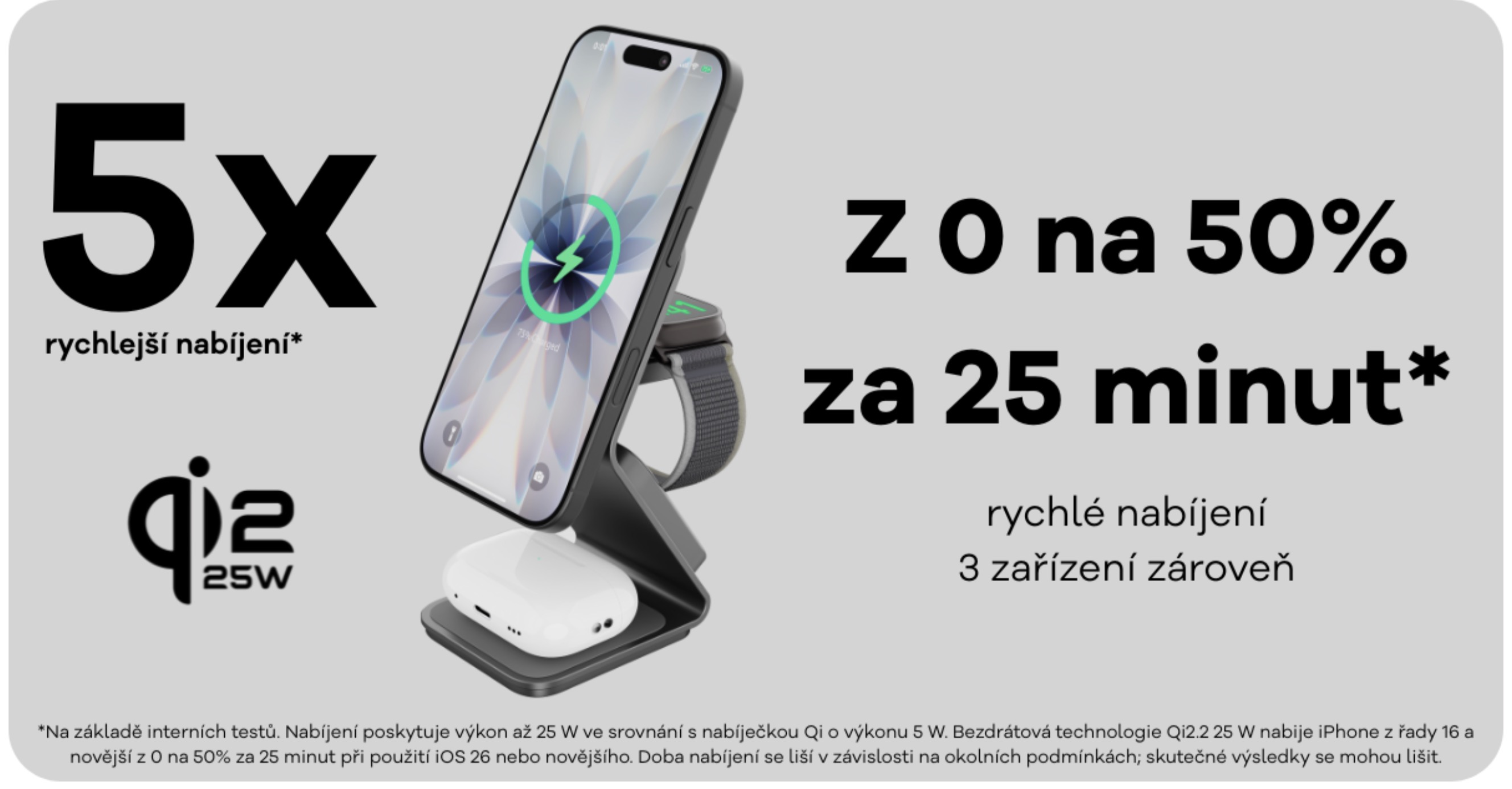 - Nejrychlejší standard Qi2.2: Nabíjení iPhonu výkonem 25 W – z 0 na 50 % za 25 minut.