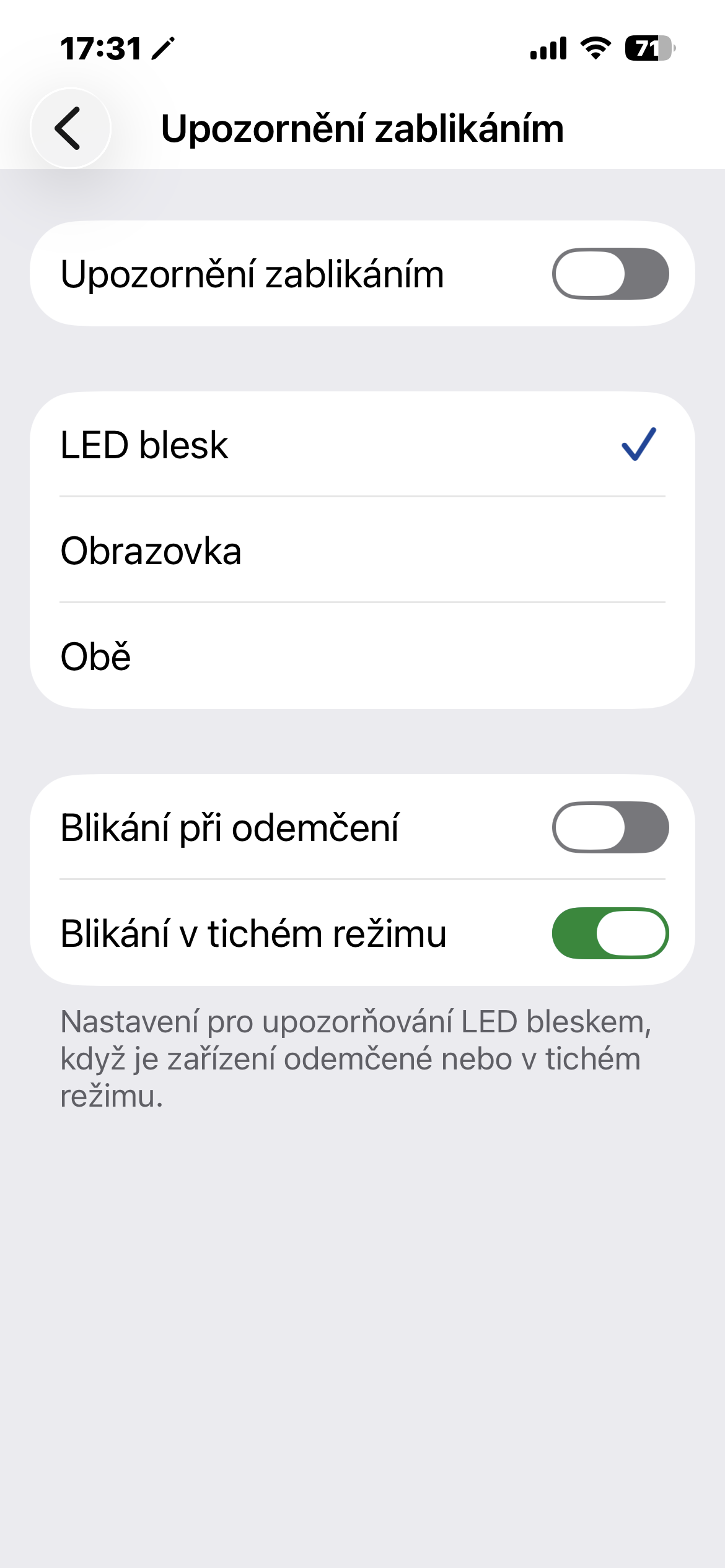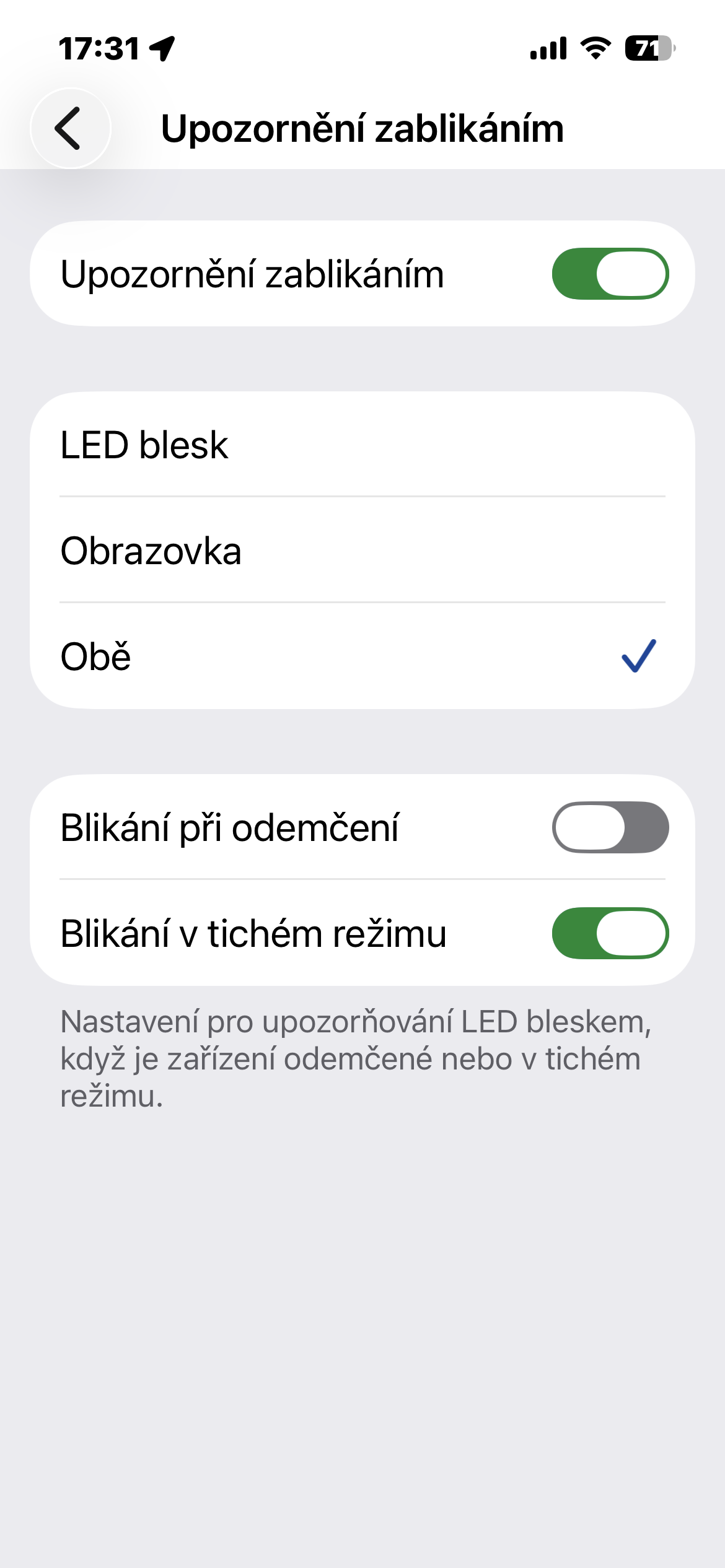 Zde aktivujete přepínač upozornění jako takový a následně si vyberete, zda má blikat LED blesk, displej, nebo obojí. Nově si můžete také nastavit, zda má k blikání docházet jen při zamčeném zařízení, a jestli má fungovat i v tichém režimu. To je důležité hlavně v případě, kdy nechcete, aby vám telefon v kapse doslova svítil přes látku.