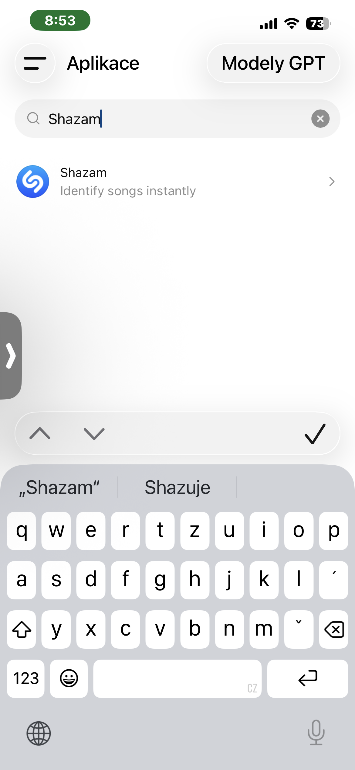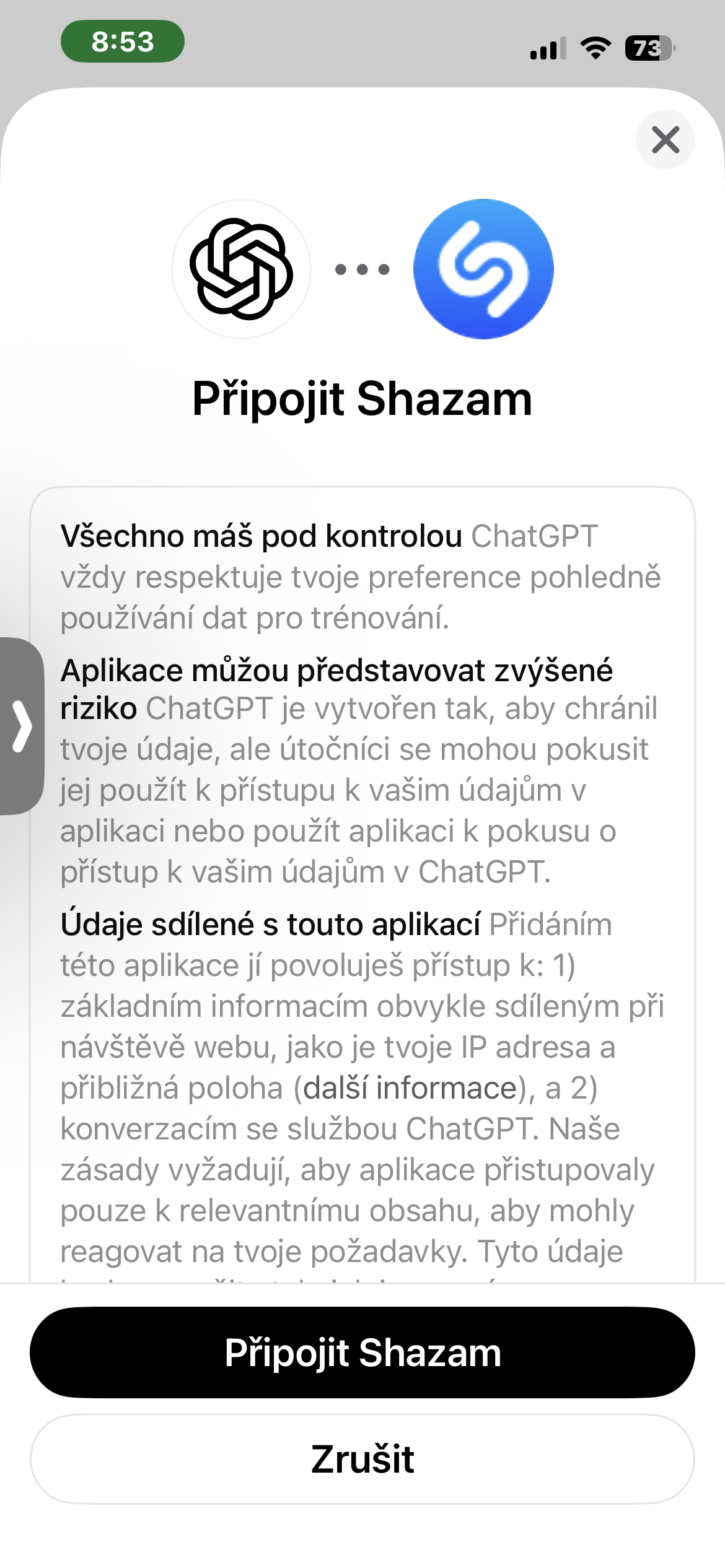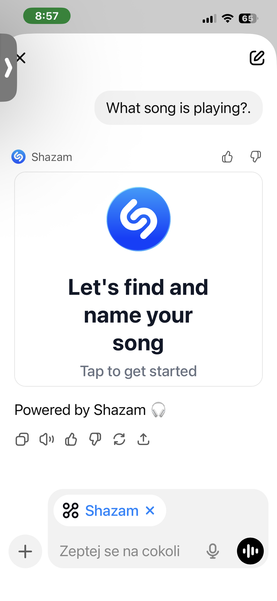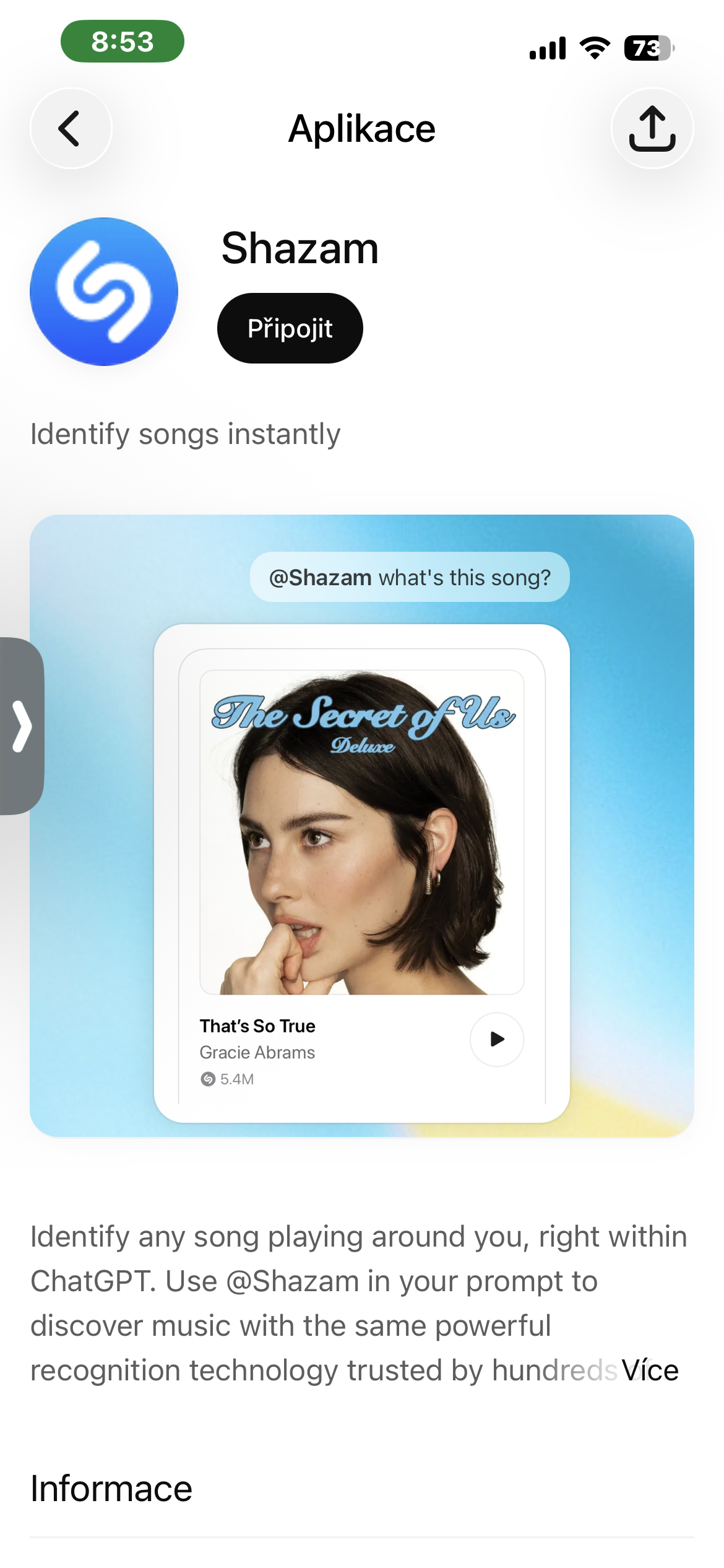 Podle dostupných informací by Shazam v ChatGPT měl fungovat přirozeně a okamžitě. Když jsem novou funkci zkoušela, zjistila jsem, že tomu tak není – alespoň u mě. Nestačí jen zadání požadavku v chatu, musíte se vrátit do sekce Aplikace, přímo vybrat Shazam, chvilku počkat, klepnout na příslušné tlačítko a poté začne rozpoznávání jako takové. Já osobně tedy zatím zůstanu u Shazamu v Ovládacím centru. Mimo jiné proto, že ChatGPT vlastně až tak často nepoužívám.