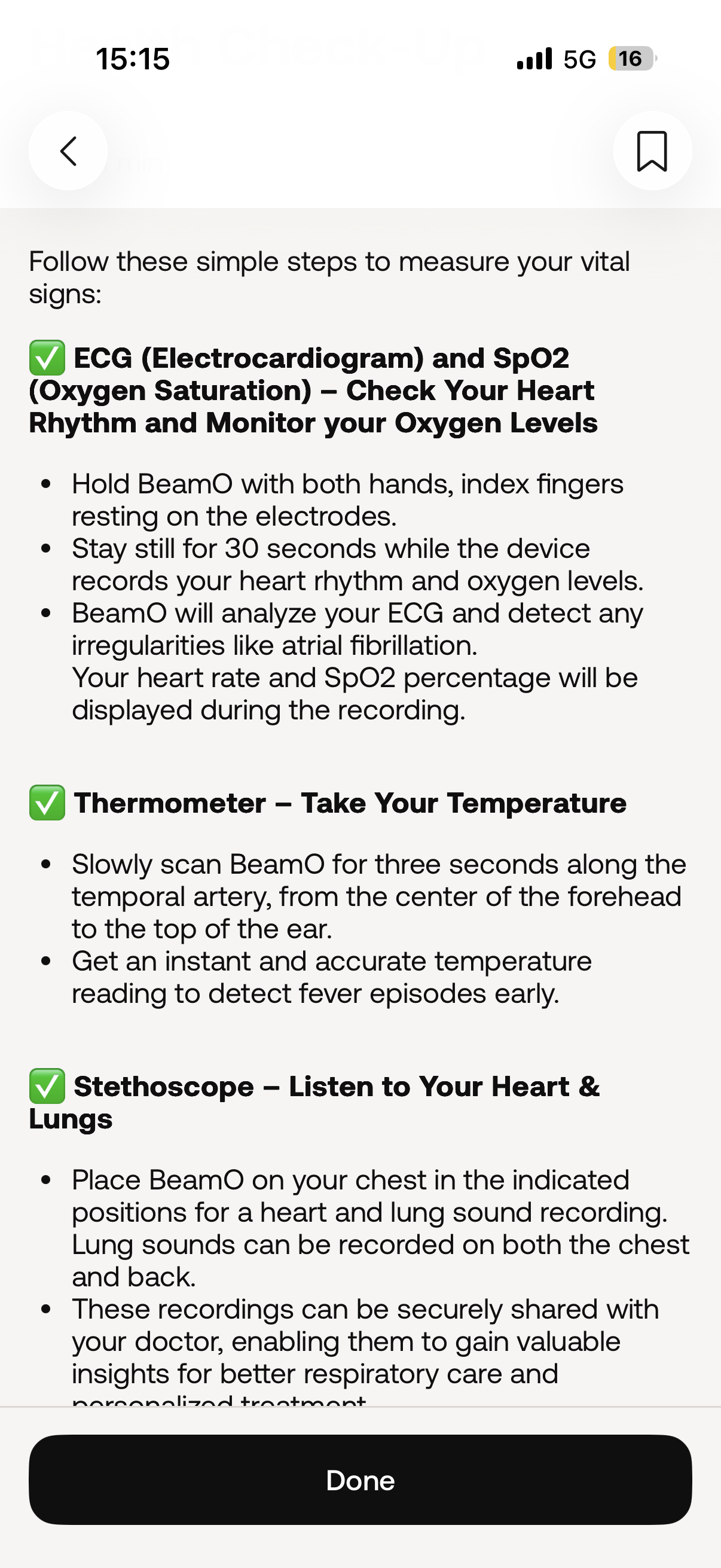 Zásadní výhodou BeamO je kombinace několika zdravotních měření do jednoho přístroje. V praxi to znamená, že během jedné minuty dokážete získat několik důležitých údajů o svém zdravotním stavu. Zařízení dokáže změřit tělesnou teplotu pomocí infračerveného senzoru, zaznamenat elektrokardiogram, změřit saturaci kyslíku v krvi a zároveň funguje jako digitální stetoskop schopný zaznamenat zvuky srdce a plic. Měření teploty je pravděpodobně nejjednodušší funkcí, ale zároveň jde o velmi praktickou záležitost. Stačí zařízení přiložit k čelu a během několika sekund získáte výsledek. BeamO využívá infračervený senzor, který měří teplotu v oblasti temporální tepny, což je metoda používaná i v nemocnicích. Výsledek se zobrazí na displeji a zároveň se uloží do aplikace, kde lze sledovat historii měření.