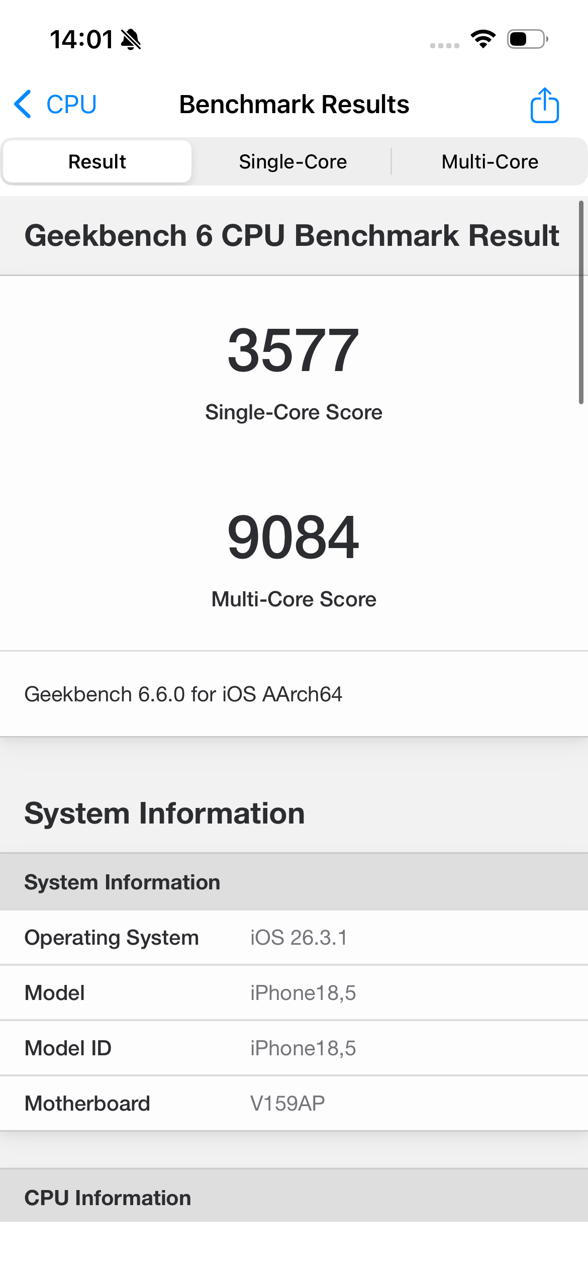 Pokud si potrpíte na benchmarková měření, mrknout můžete na výsledky z Geekbench 6, kde v první galerii naleznete měření z iPhone 16e a ve druhé pak porovnání s výsledky z iPhone 17e.