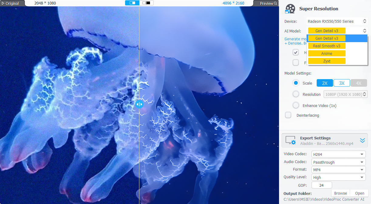 VideoProc Converter AI je komplexní řešení pro práci s multimédii s integrovaným nástrojem pro vylepšení videa pomocí umělé inteligence. Jednou z jeho klíčových funkcí je nástroj Super Resolution. Ten představuje automatický proces 4 v 1: odstranění šumu, odstranění rozmazání, obnovení detailů a zvýšení rozlišení. Pomocí AI můžete snadno vylepšit své video o 200 %, 300 % nebo 400 % až na kvalitu 4K. To je obzvláště užitečné pro vylepšení vizuální kvality letitých domácích videí, záznamů z dovolené a každodenních okamžiků.