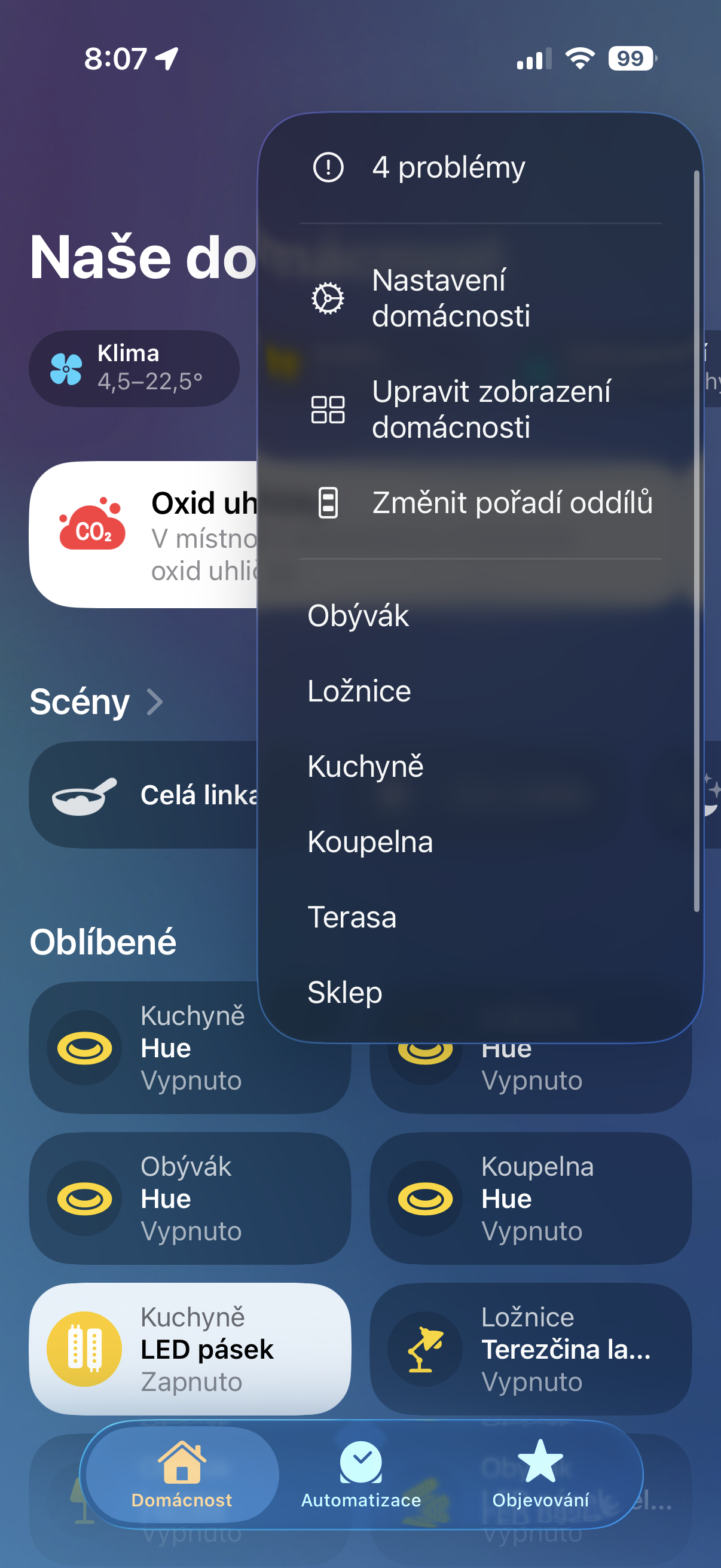Na první pohled se sice může zdát, že je Domácnost v iOS 26 takřka stejná jako v iOS 18 a starších verzích OS, tedy samozřejmě vyjma Liquid Glass kabátku a pár dalších prvků, které Apple spolu s ním přidal pro hezčí vzhled. Realita je ale taková, že předěláním tří teček symbolizujících vstup do nastavení Domácnosti Apple bůhvíproč skryl viditelné upozornění na zařízení, která měla nějaký problém (typicky přestala komunikovat).