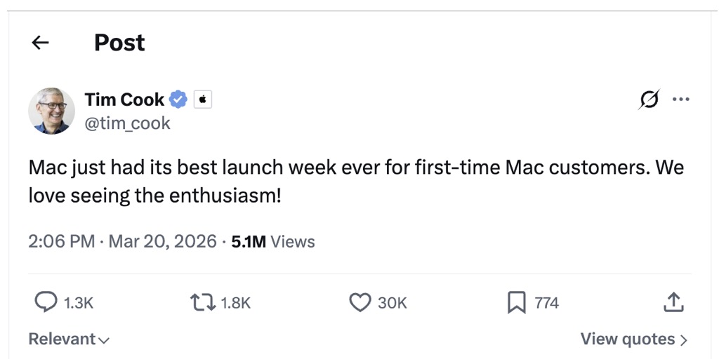 Přesto může být jeho význam mnohem větší, než naznačují samotná prodejní čísla. Podle Tima Cooka zaznamenal Mac nejlepší úvodní týden v historii z pohledu počtu nových zákazníků. A právě to je možná nejdůležitější signál. Nejde jen o marži na jednom zařízení, ale hlavně o to, kolik nových lidí Apple přivede do svého světa.