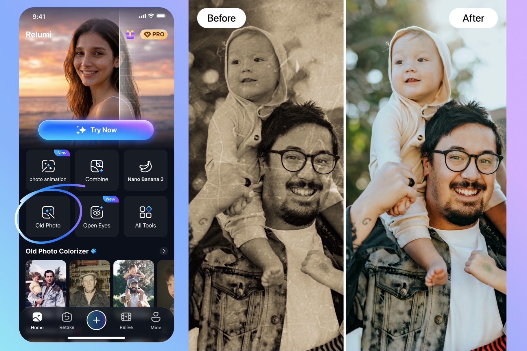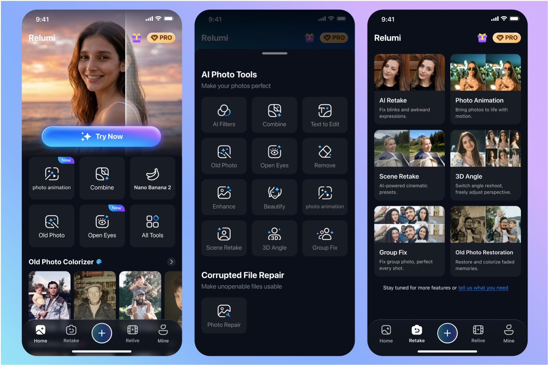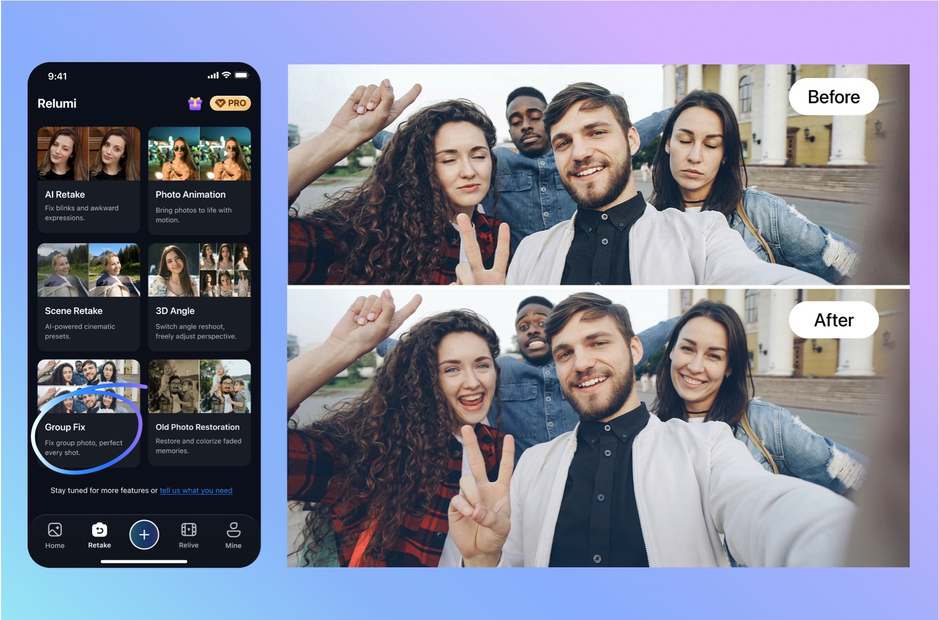 AI Photo Retake remains the clearest core pitch, while features like AI Photo Restoration and Photo to Video expand Relumi’s value for users who want to make meaningful photos usable again, not just cleaner.