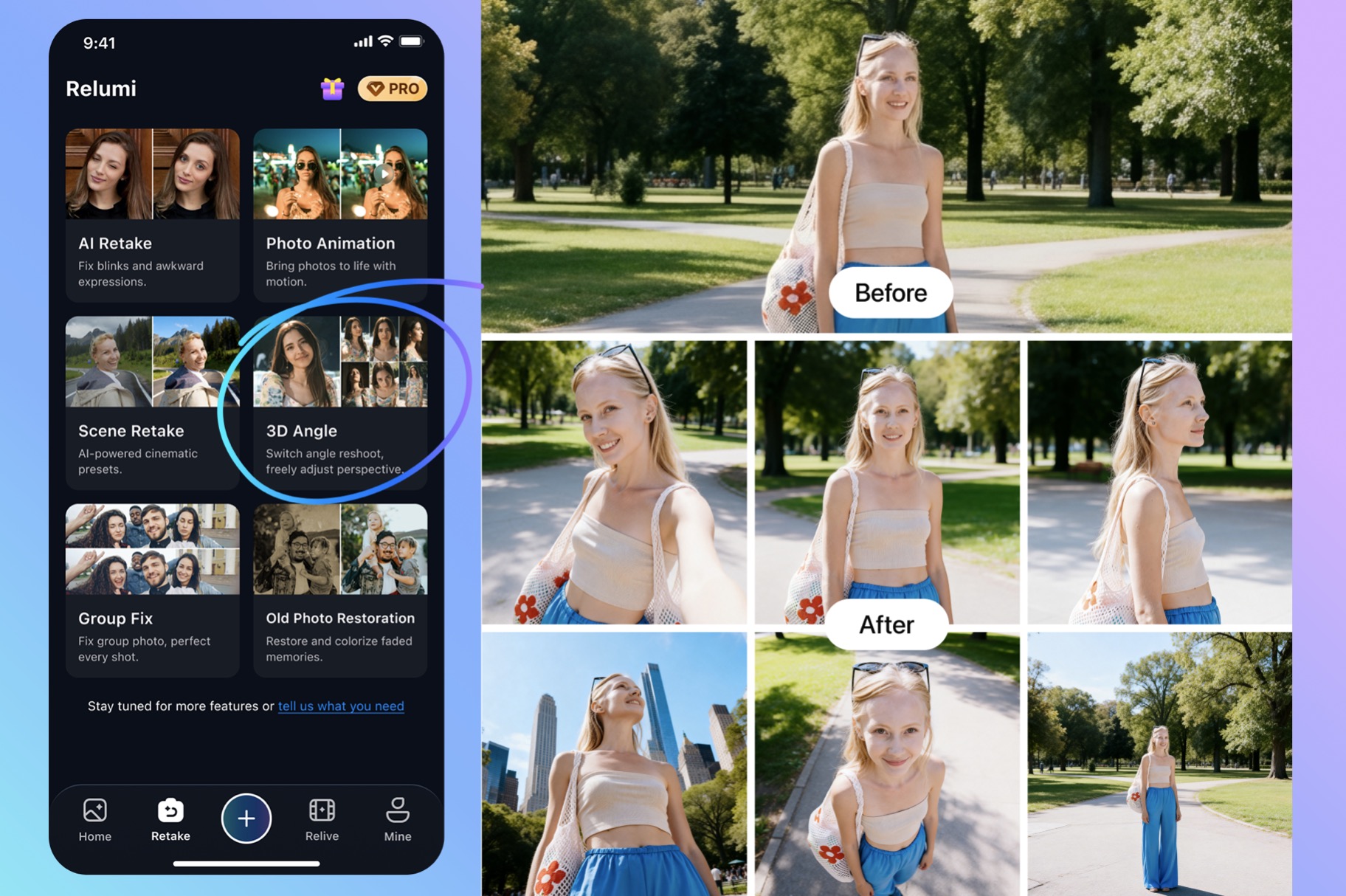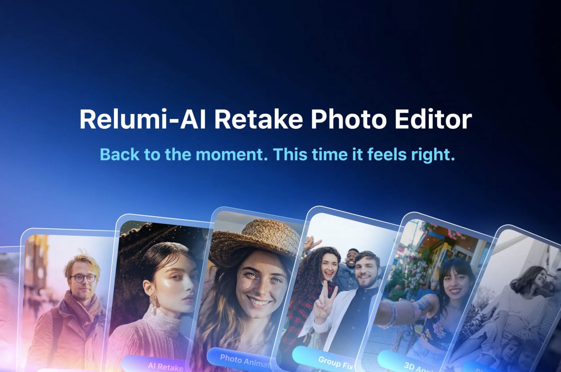 Relumi is built around portrait correction, scene enhancement, and light creative tools for memory-focused photo use, but the product identity becomes much clearer when everything is framed under one headline idea: helping users retake a photo with AI after the original moment has already passed.