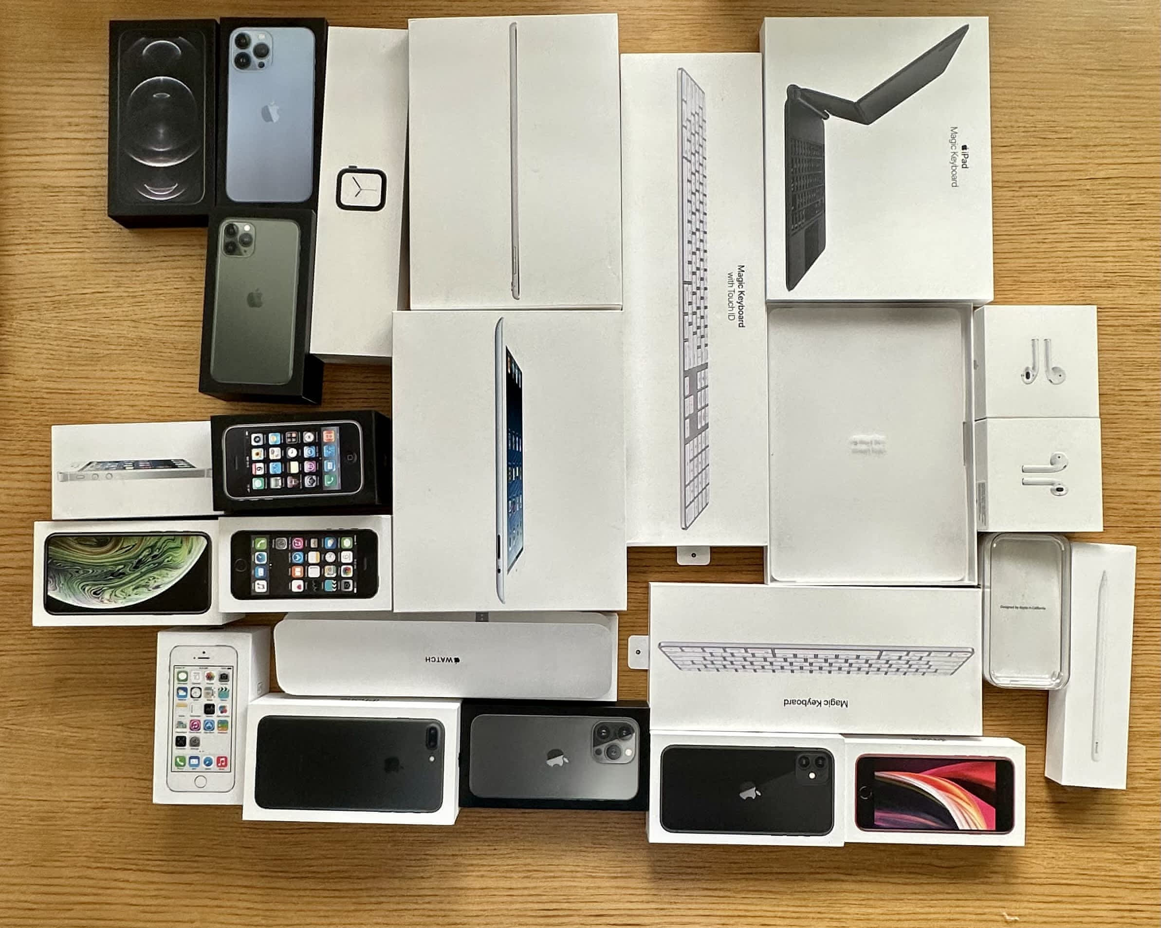 25 různých druhů krabic od produktů Apple. Ve většině případů včetně manuálů, plastové folie, případně obalů od sluchátek.