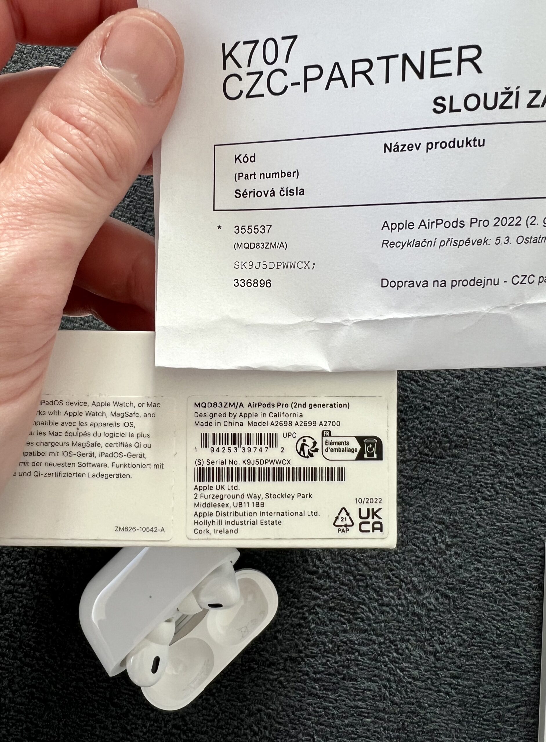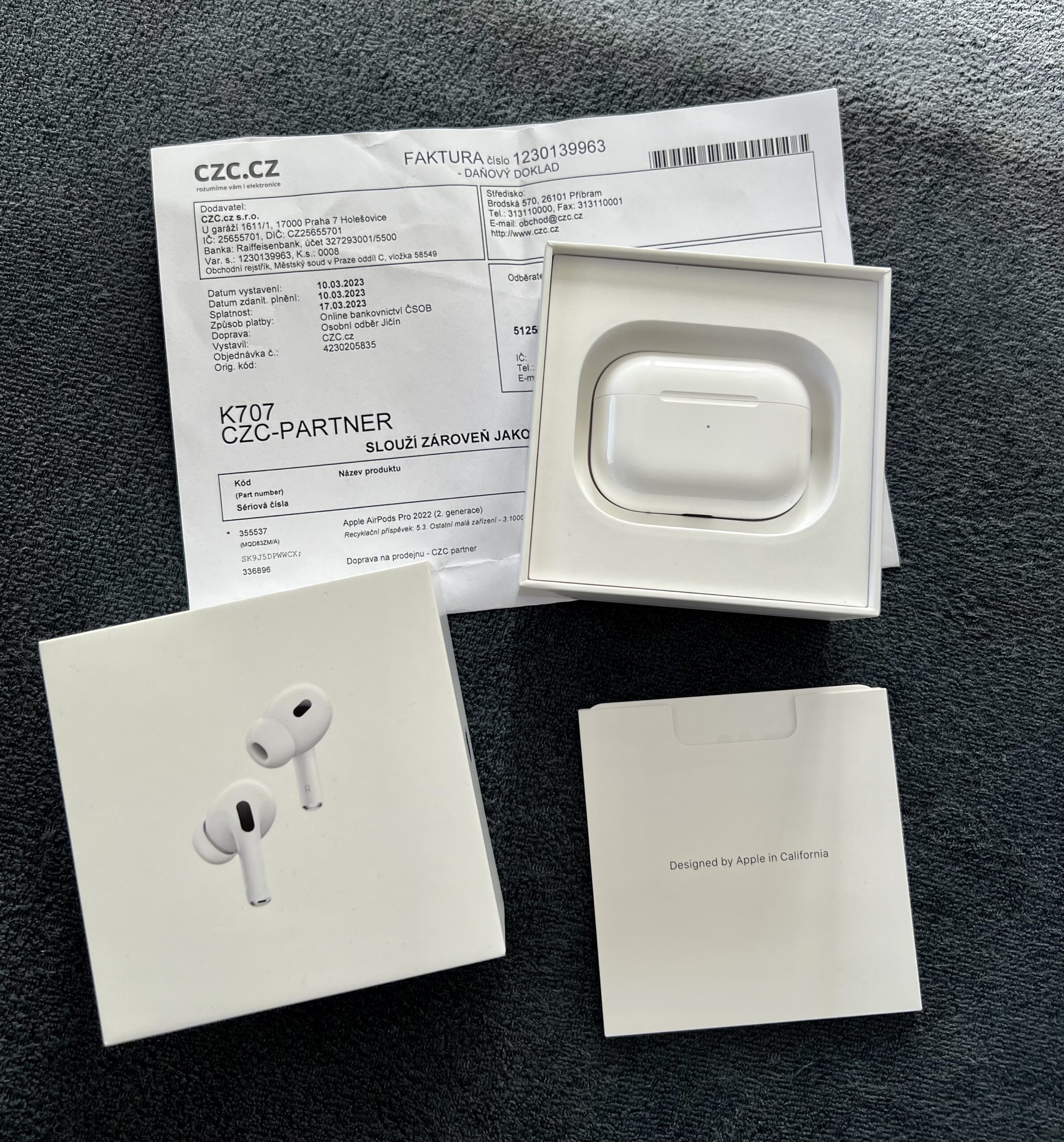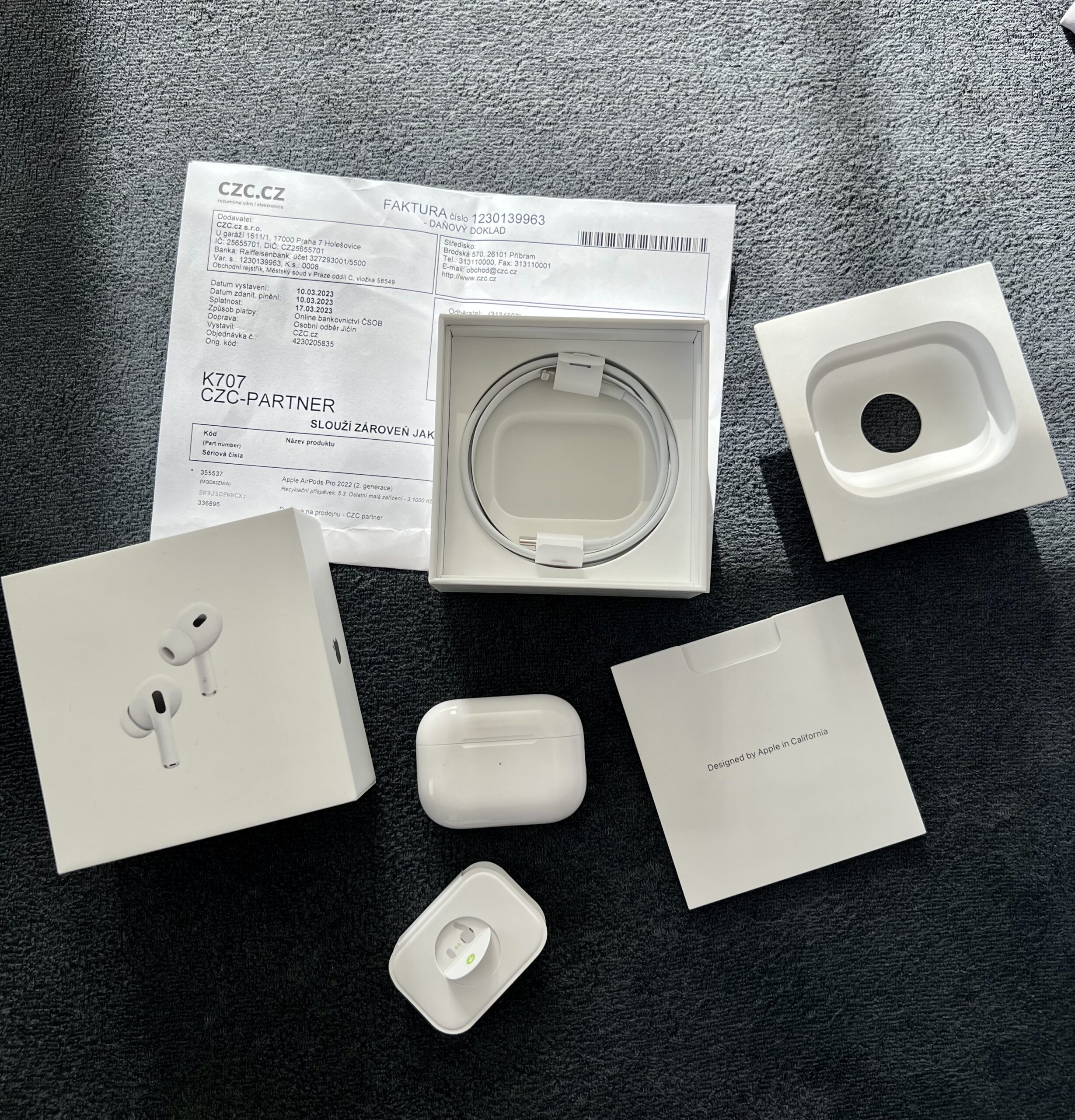 Prodám nové, pouze vyzkoušené Apple AirPods Pro 2022, zakoupeno 10.3.2023 u CZC.