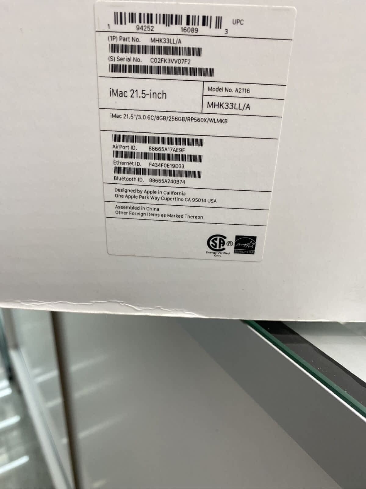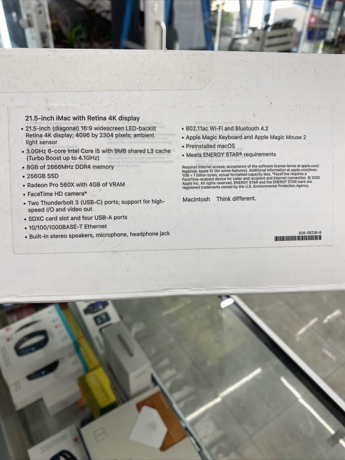 V krabici 21.5 -inch iMac s displejem sítnice 4k, magická klávesnice, magická myš 2, napájecí kabel, lightning to USB kabel