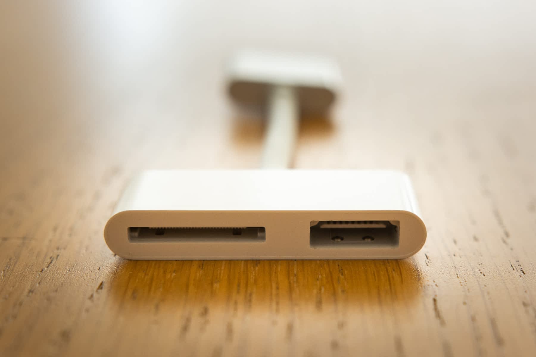 Use the Apple Digital AV Adapter to mirror whatever’s on your iPad or iPhone 4S screen — apps, presentations, websites, and more — on your HDTV or HDMI-compatible display in up to 1080p HD (movies play at up to 720p). Watch slideshows and movies on the big screen in up to 720p by connecting your iPad, iPhone 4, or iPod touch (4th generation) to an HDTV or HDMI-compatible display. The Apple Digital AV Adapter routes digital audio to screens that support it. Connect the Apple Digital AV Adapter to your iPad, iPhone 4, iPhone 4S, or iPod touch (4th generation) via the 30-pin dock connector and to your HDMI-compatible display using an HDMI cable (sold separately). A second 30-pin connector built into the AV adapter lets you charge and sync your device while it’s connected to your HDMI-compatible display.