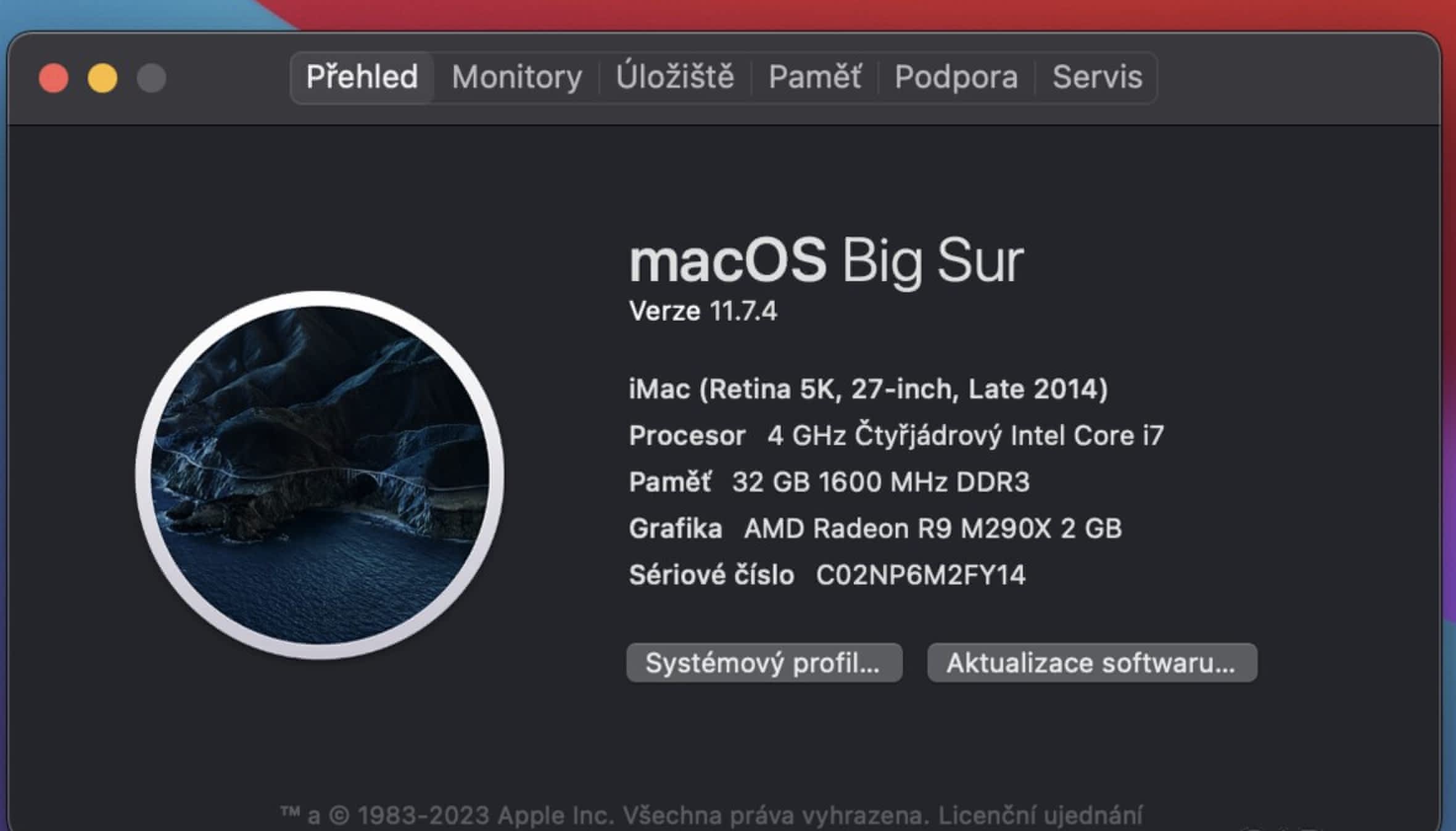 Bez problémů zvládá jakoukoli práci včetně střihu videa a úpravy fotek, opravdu velmi svižný stroj. iMac je celkově ve velmi pěkném stavu a 100% funkční, pouze lehce odštíplé sklo v levém spodním rohu viz foto (téměř není postřehnutelné). Momentálně odborně vyčištěn s čistým operačním systémem BigSur viz fotografie (na žádost mohu doinstalovat nejnovější OS Ventura).