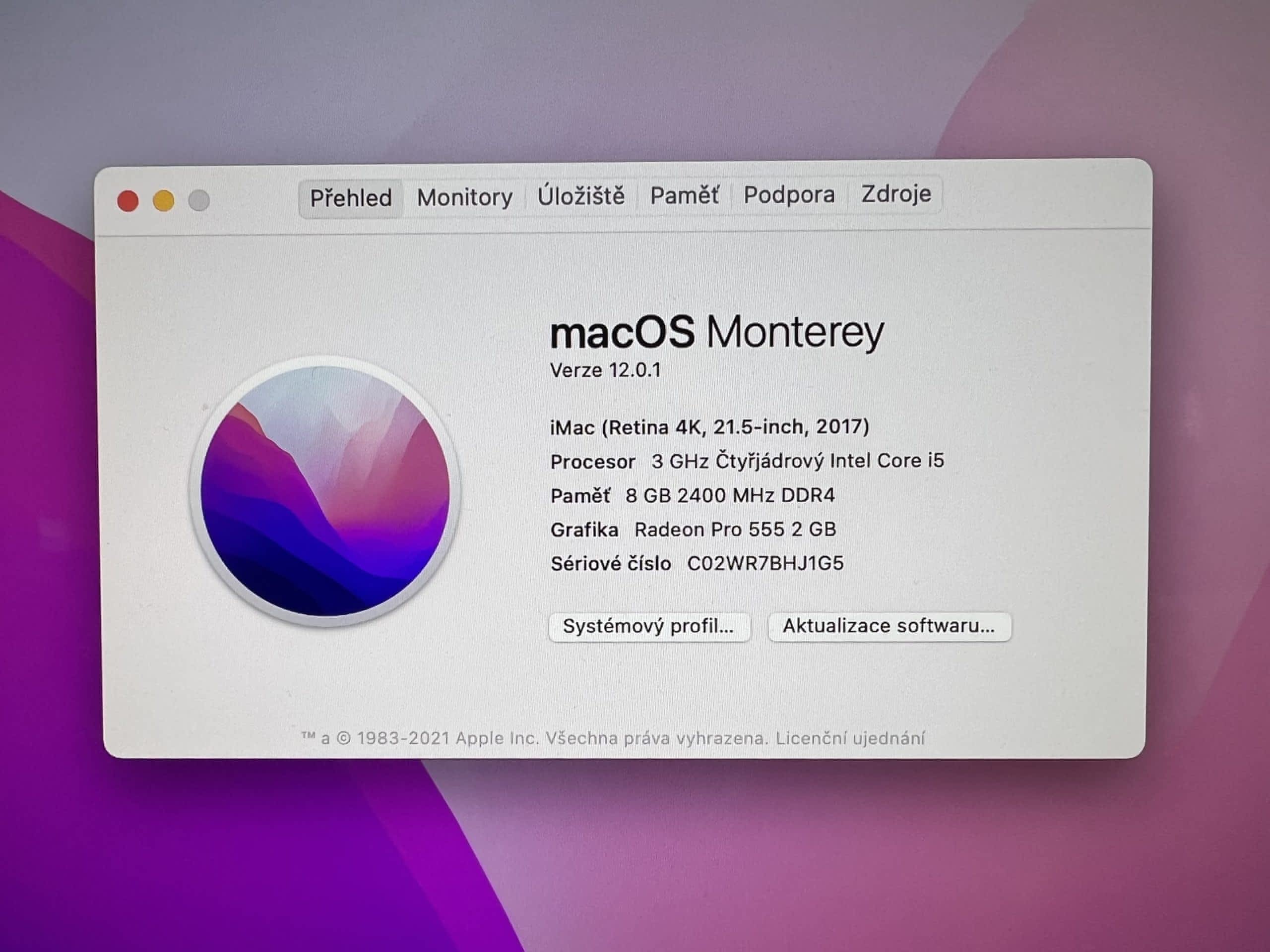 Zbytek konfigurace viz. foto. Stav krásný, nepoškrábaný, neotlučený, plně funkční. Jen drobná vada je slabší výkon mikrofonu. Je funkční, ale tichý. Jinak vše v pořádku. Systém macOS Monterey.