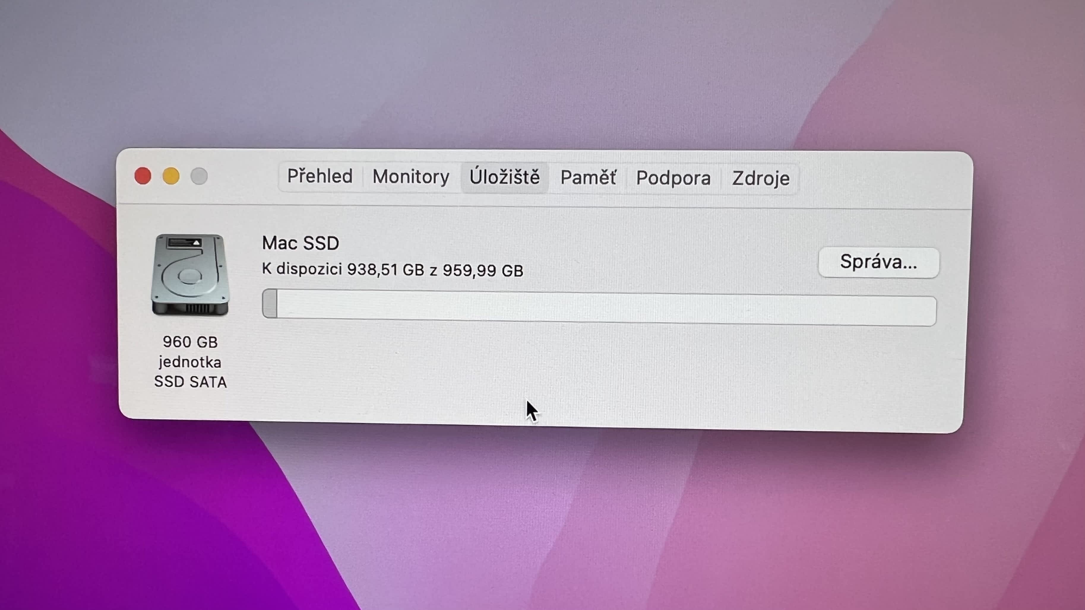V iMacu byl upgradován původní disk na 1TB SSD = bleskurychká práce oproti verzím s HDD nebo Fusion Drive!