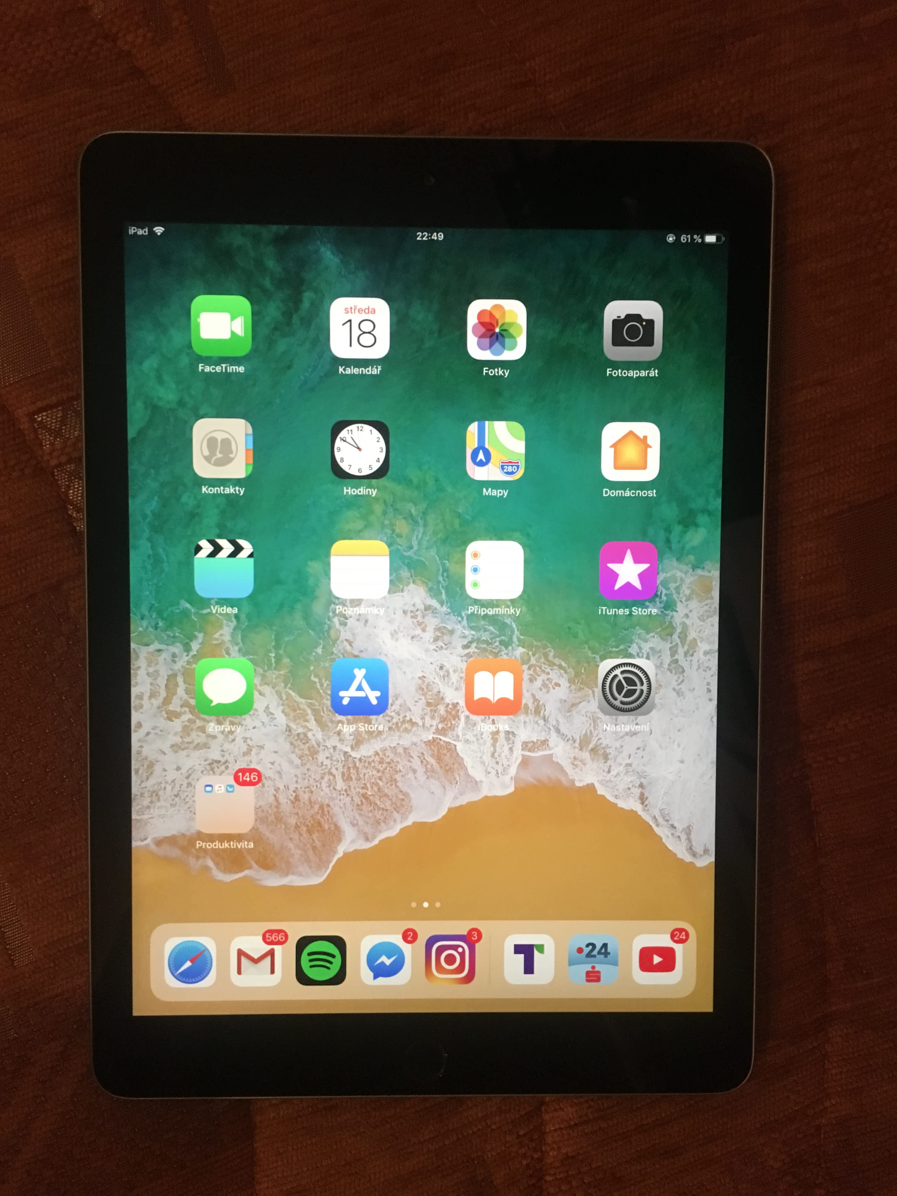 prodám tento Apple iPad 9.7 (2018). Kupovaný 31.5.2018. Používaný zhruba jednou dvakrát za den. Někdy jsem ho nepoužil třeba dva tři dny v kuse, takže minimálně starý a minimálně používaný. Právě z tohoto důvodu ho prodávám, pro svojí práci a moje záliby mě stačí počítač s mobilem.