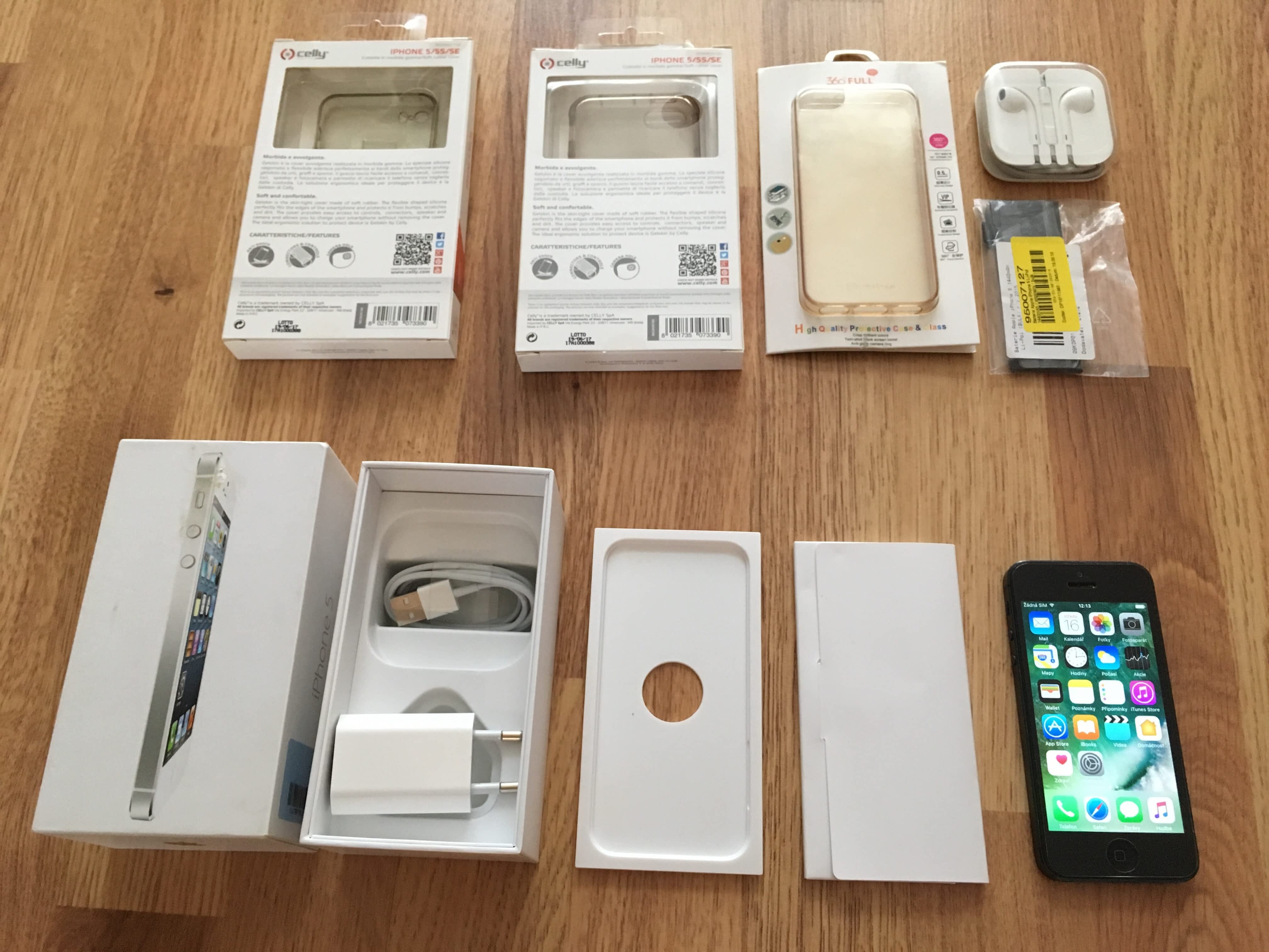 Prodám iPhone 5 v černé barvě ve velmi dobrém stavu (9 z 10), neblokovaný a to včetně originálních sluchátek Apple EarPods, nalepeného tvrzeného skla přes displej, třech silikonových obalů, nabíječky a USB kabelu.
