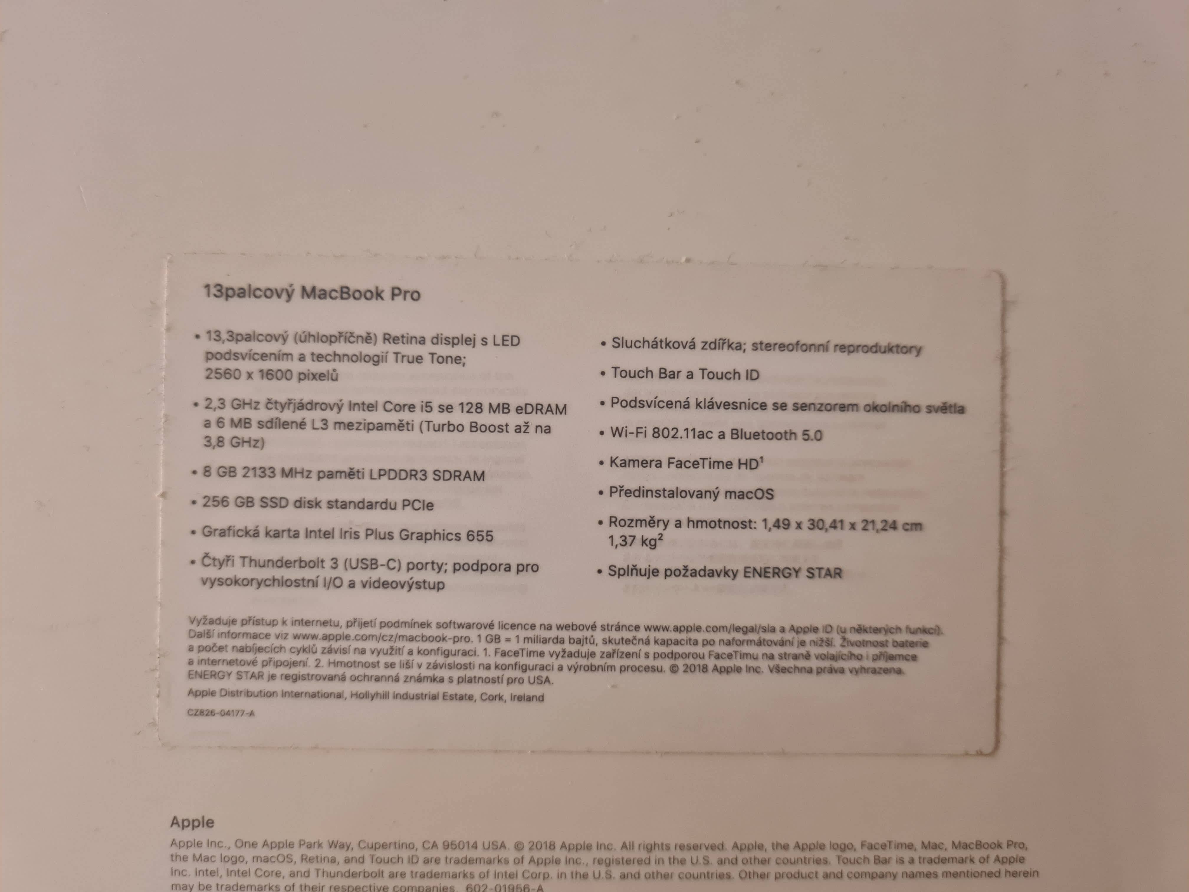 Prodám málo používaný Macbook Pro 13", rok 2018. Kupován v 9/2018 na Alze. Používán v dokovací stanici. Minimální známky opotřebení. S prodejem předám kompletní balení a dokumentaci. Původní cena 52 000 Kč.
