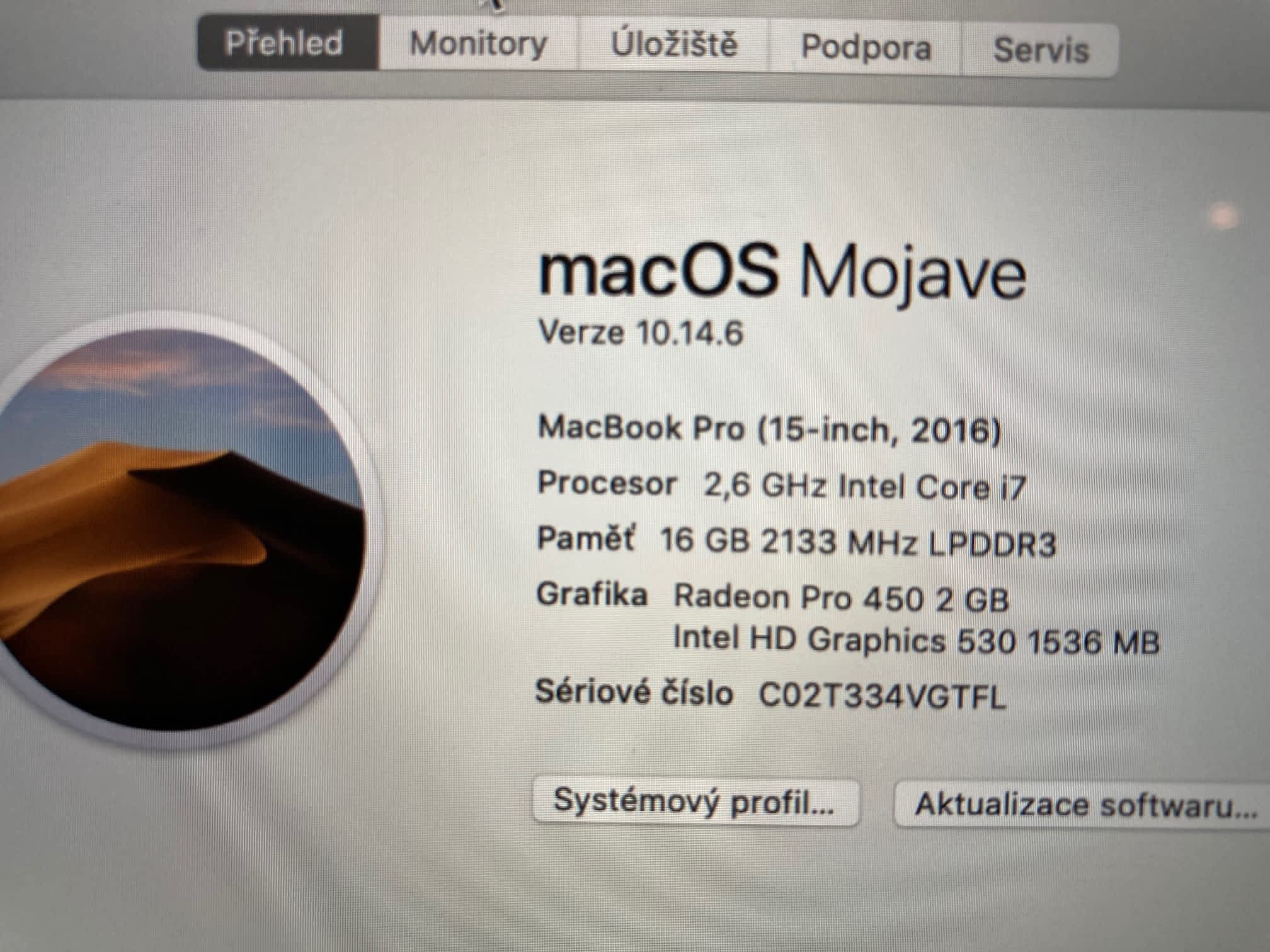 15 Apple MacBook Pro i7 2,6GHz RETINA TouchBar QuadCore SpaceGrey model Rok 2016 (kupovaný v květnu 2017). SSD 256Gb, 16Gb Ram DDR 3 2133MHz. Baterie má pouze 88 cyklů / 98% původní kapacity. Grafika intel HD 530 1536Mb + AMD Radeon Pro 450 2Gb. MacBook reinstalovaný ve skvělém stavu. Podsvícená klávesnice, Wi-iFi, BlueTooth 4.0, 4x Thunderbolt 3 /USB-C, FaceTime HD WebKamera, Force Touch trackpad. Preferuji osobní předání s vyzkoušením.