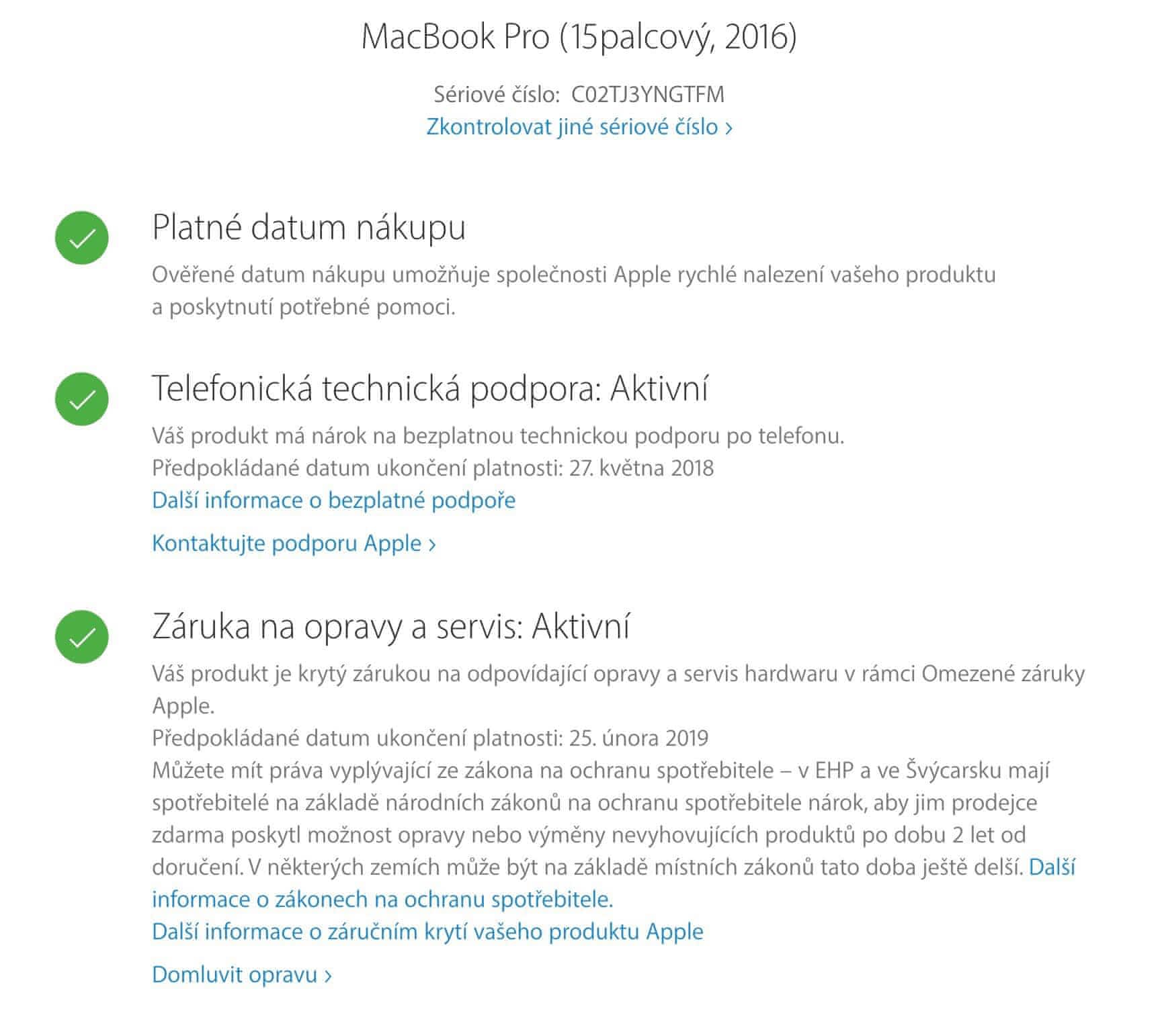 Počítač je nový, jen rozbalený a vyzkoušený, v mezinárodní záruce do 25. února 2019 (lze případně dokoupit Apple Care a prodloužit záruku na 3 roky).