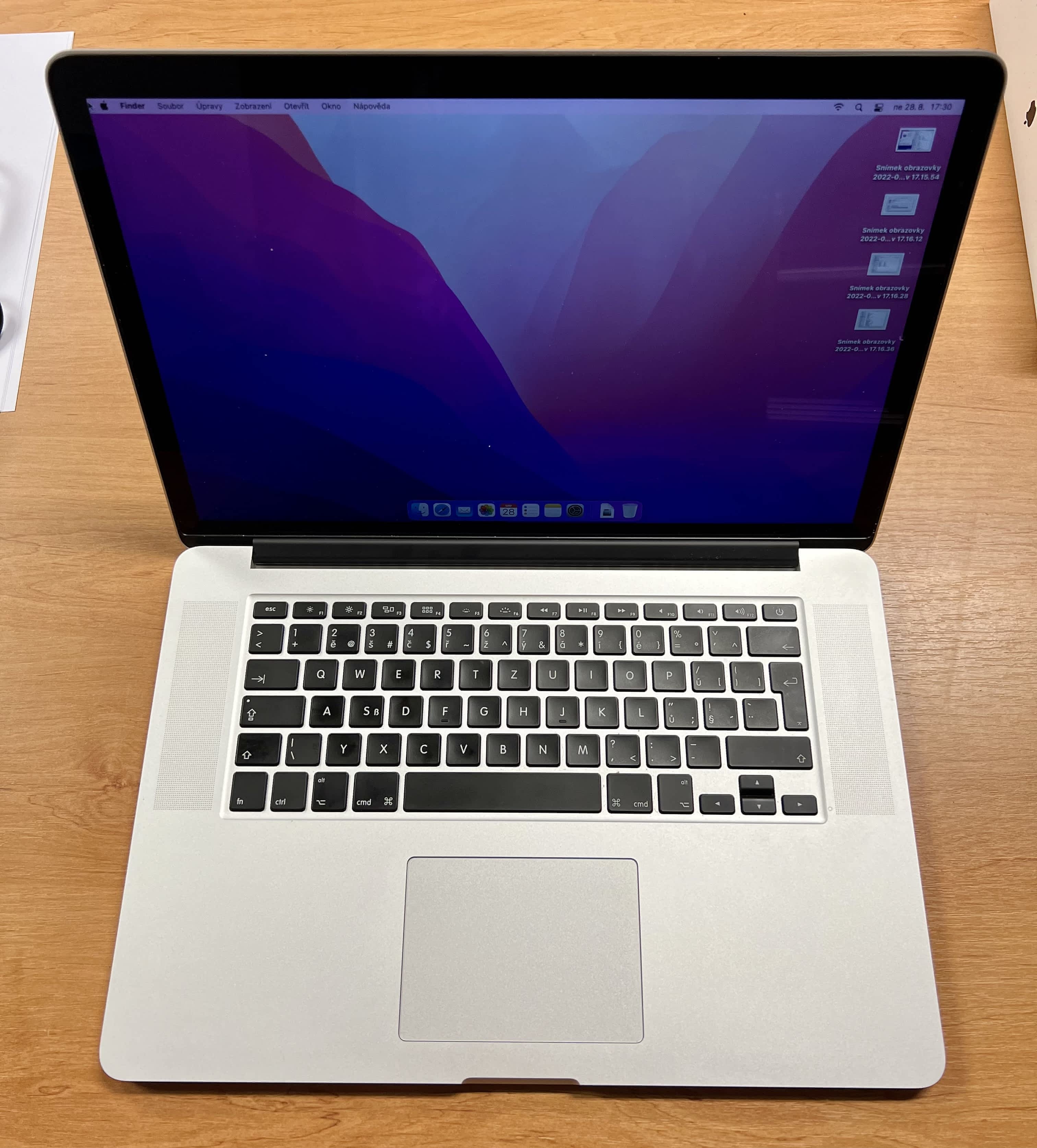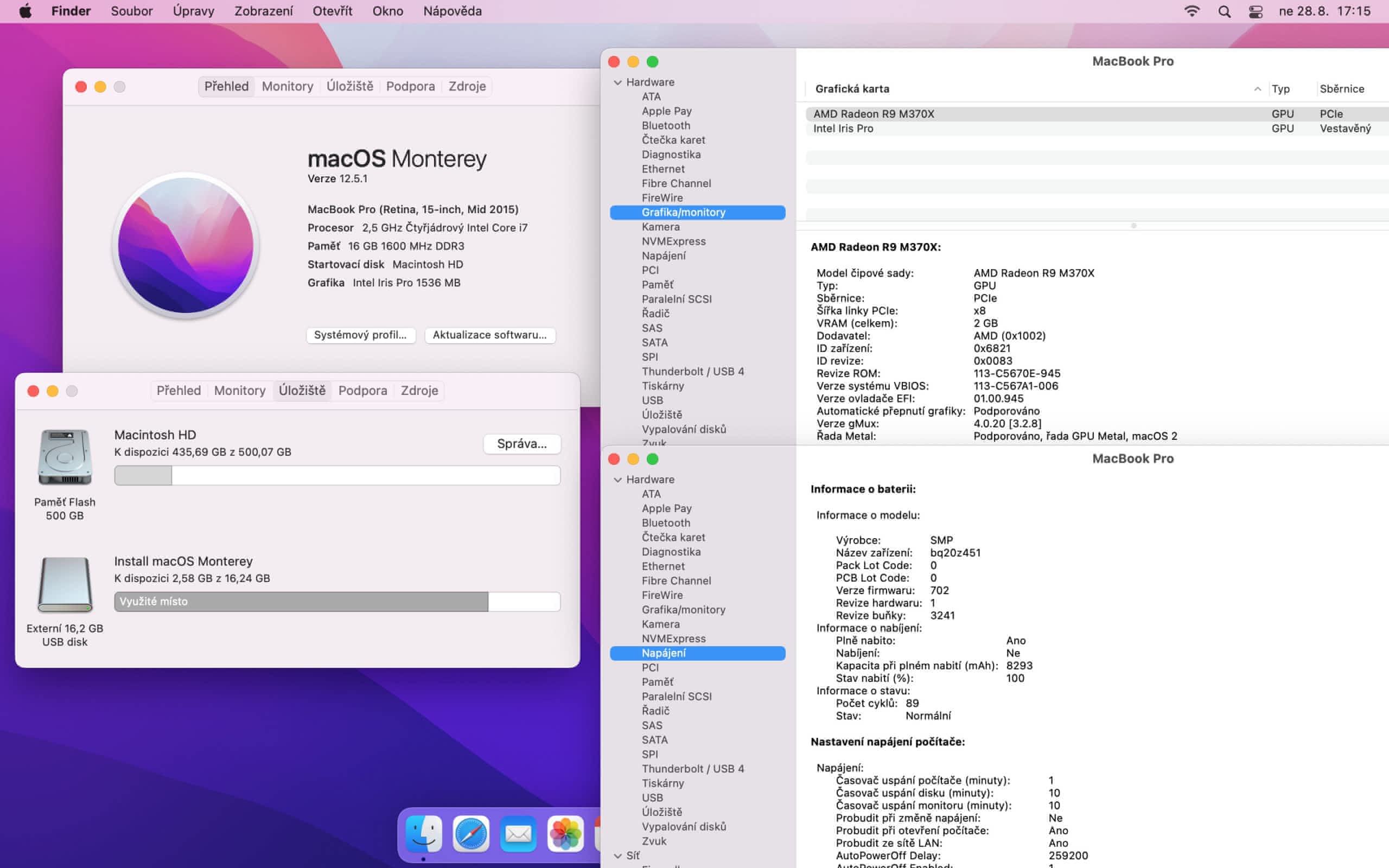 MacBook disponuje 16GB ram, 500GB SSD a dedikovanou grafickou kartou M370X 2GB, baterie originální původní 89 cyklů.