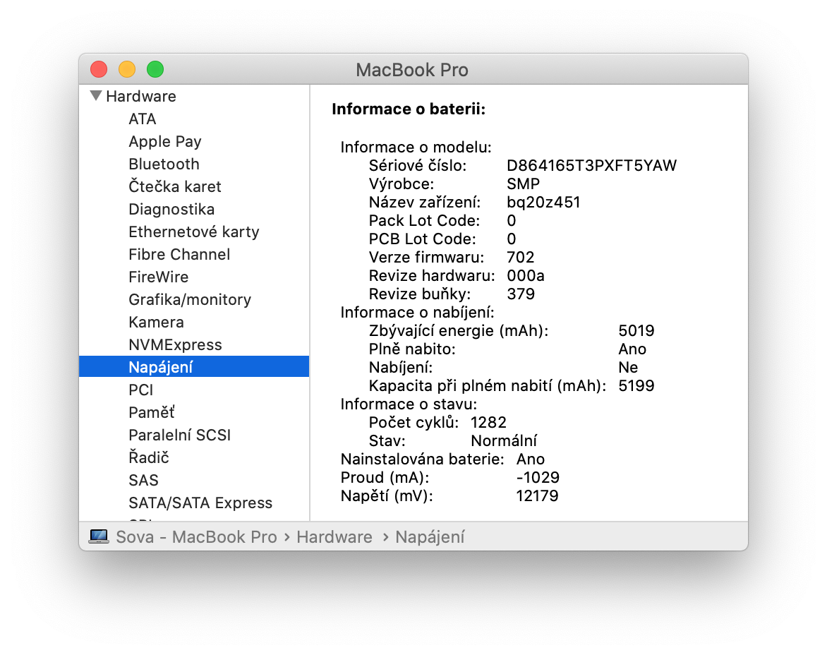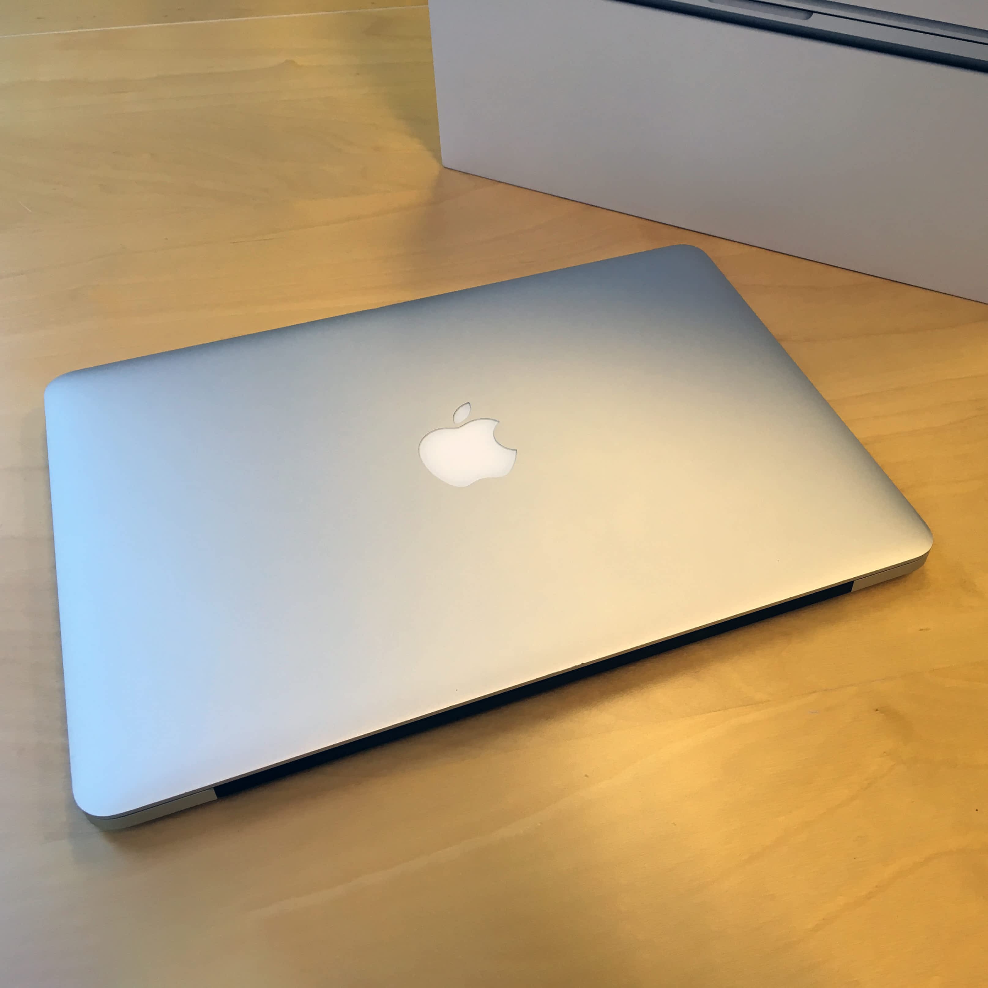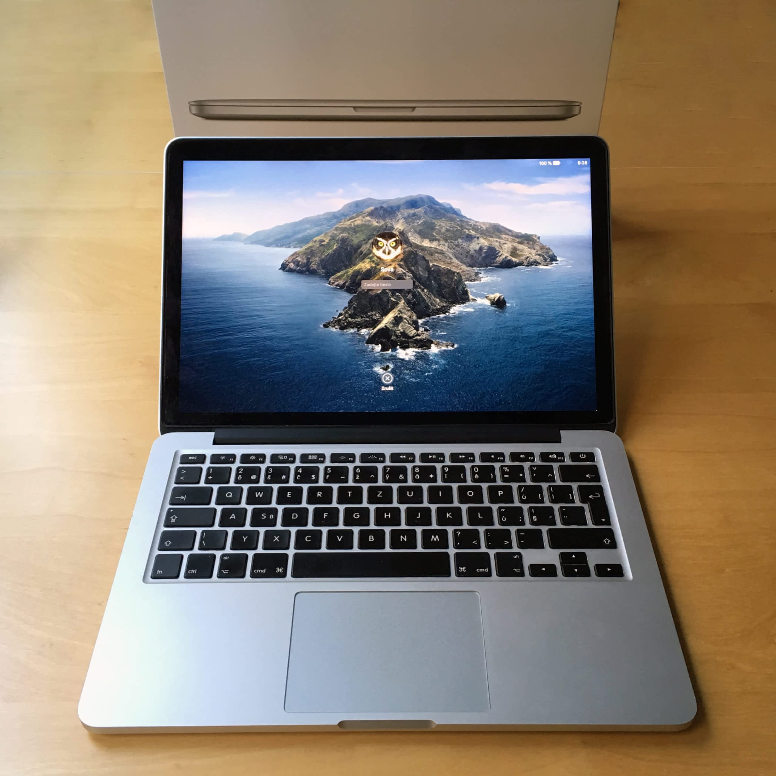 Kompletní balení (krabice + nabíječka). Slušná výdrž: baterie má 1281 cyklů, ale stále 5199 mAh z původních 6330 mAh. Použivaný, ale plně funkční; poškozená antireflexní vrstva na displeji, při běžném používání to ale není znát. Aktualizováno na nejnovější macOS Catalina.