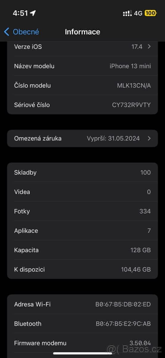 Prodam Apple Iphone 13 Mini 128 gb White ve výborném stavu. Neblokovaný – Dual SIM, česká distribuce od T-Mobile, záruka 24 měsíců. Aktivován 31.5.2023 (roční mezinárodní záruka), poté záruka od T-Mobile CZ. Mobil po celou dobu použití v transparentním pouzdře, na displeji nalepeno tvrzené sklo.