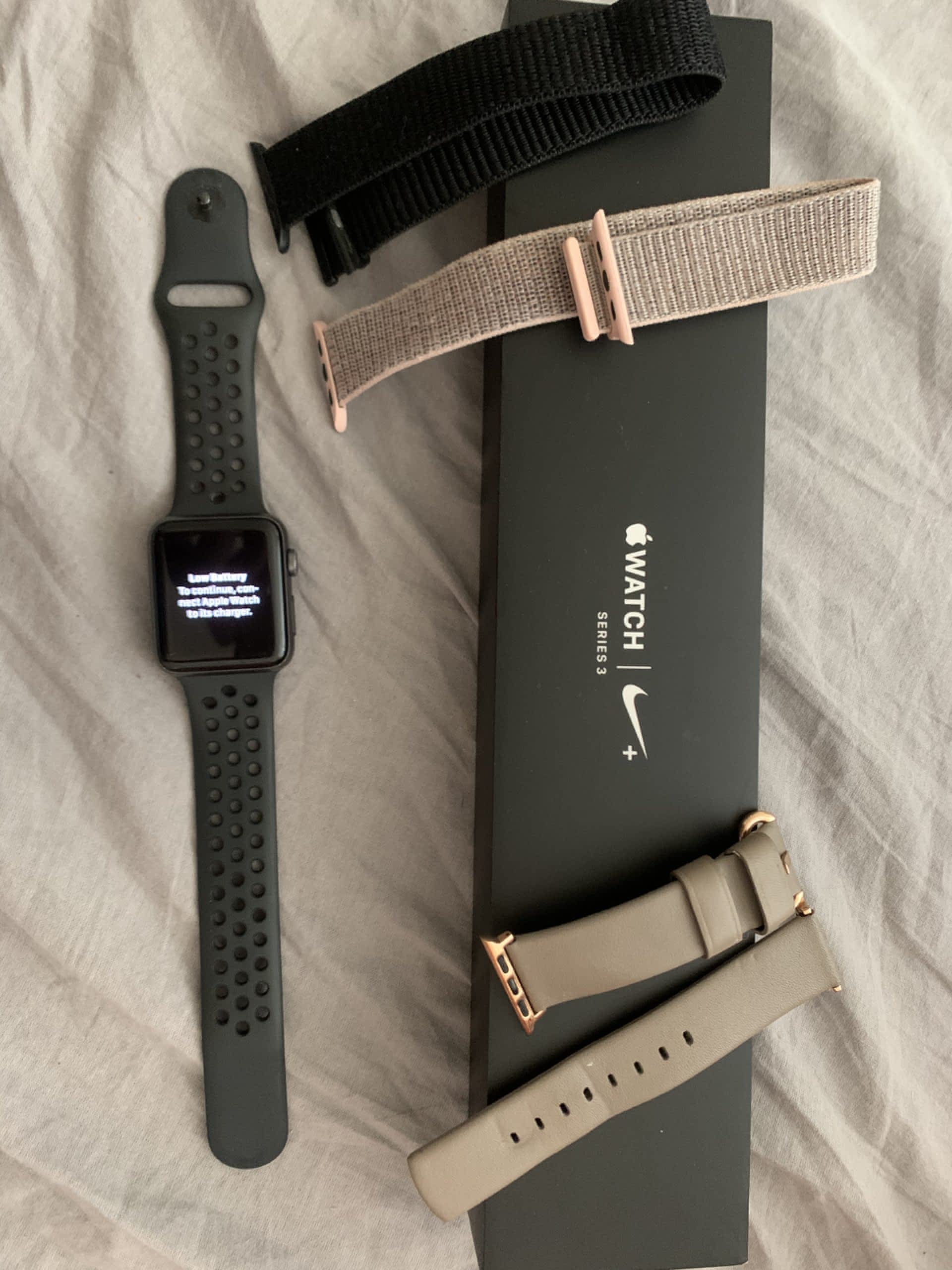 Prodám Apple Watch 3, velikost 42mm Nike sportovní edice. Hodinky jsou plně funkční, nesou známky používání. Balení je kompletní, plus přidám 3 řemínky.