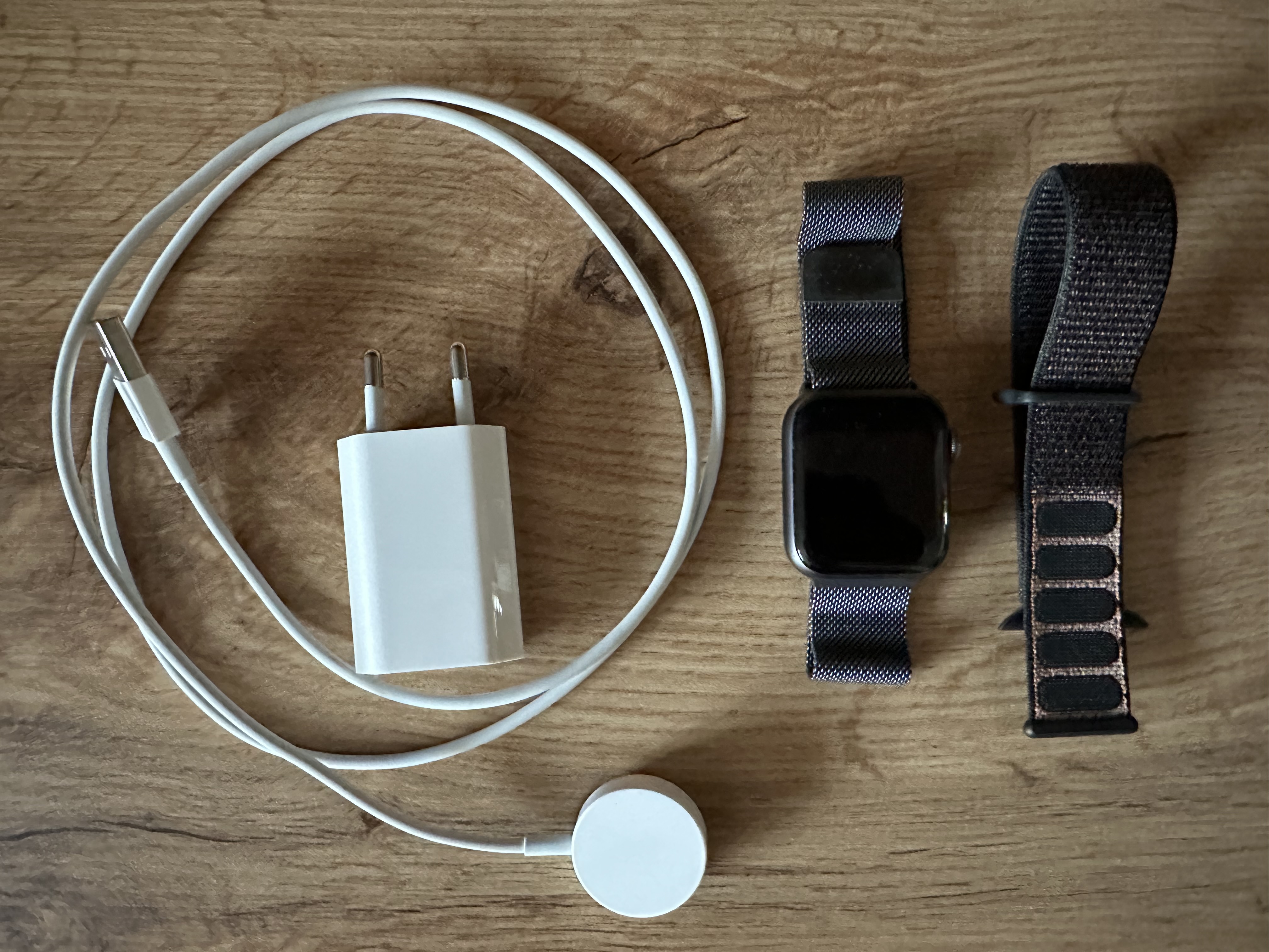 Prodám Apple Watch 4 40mm. černé, Watch OS 10, kondice baterie 75%, na skle je škrábanec (v reálu není tolik vidět jako na obrázku), nabíjecí kabel, nabíječka. Sobotka, nebo zásilkovna.