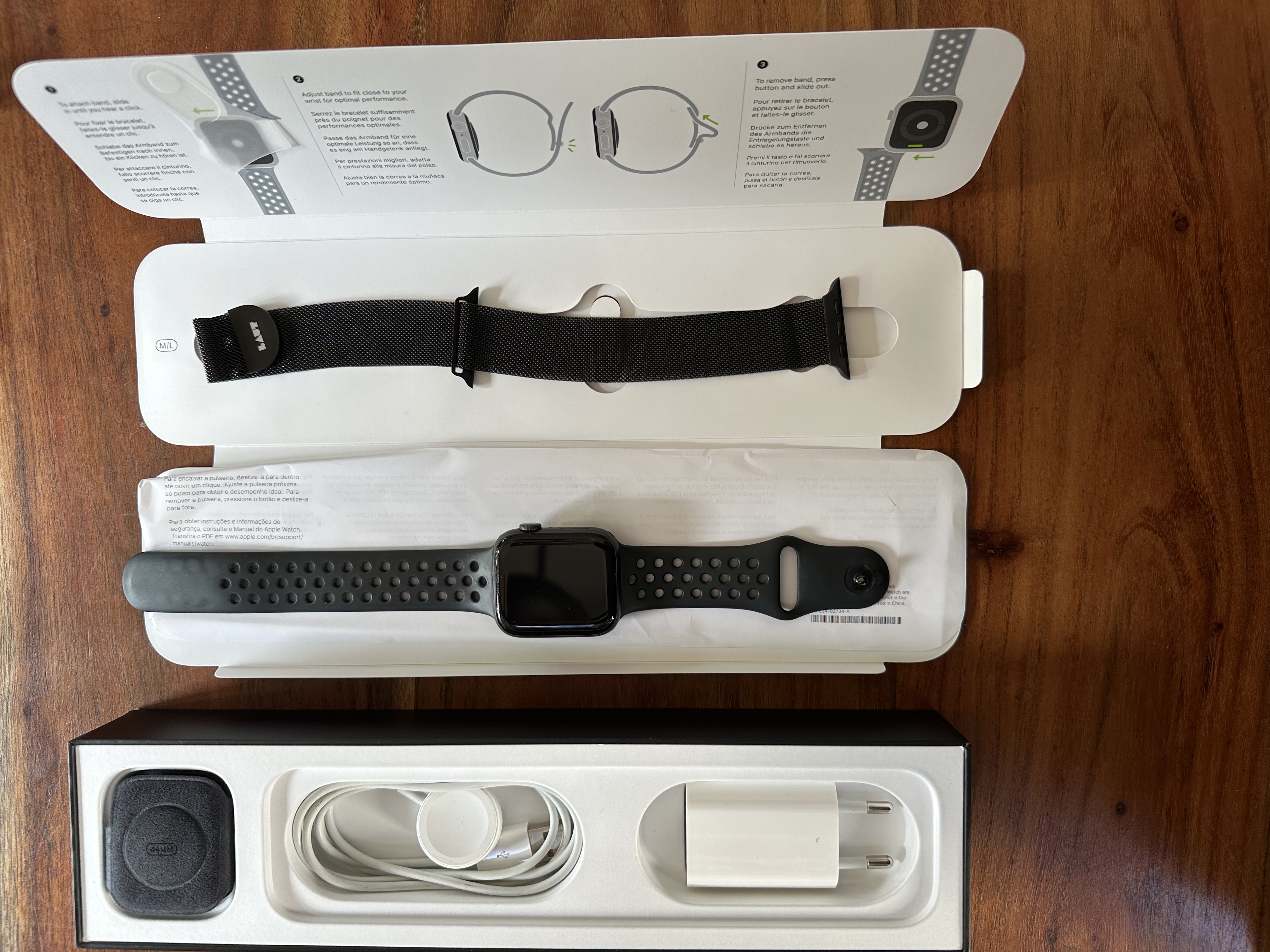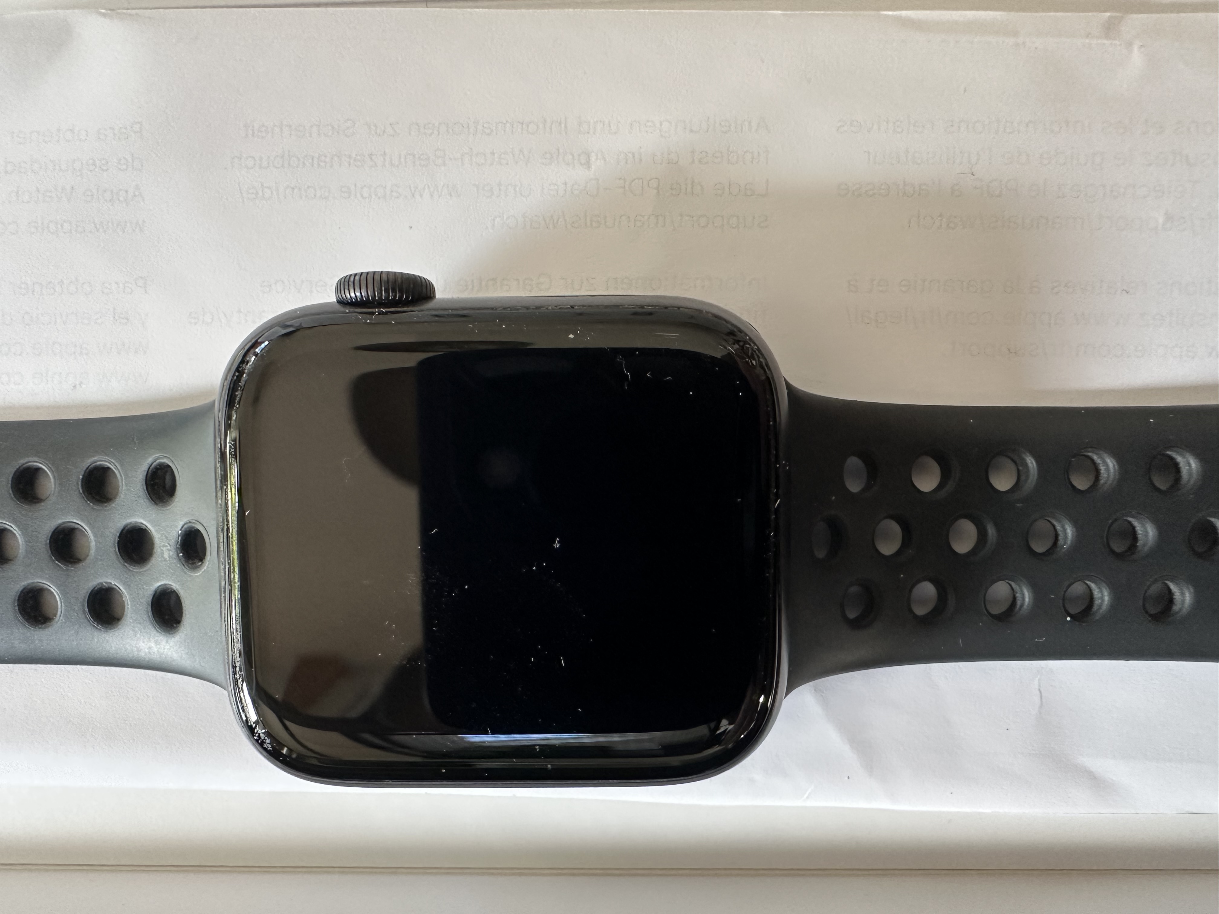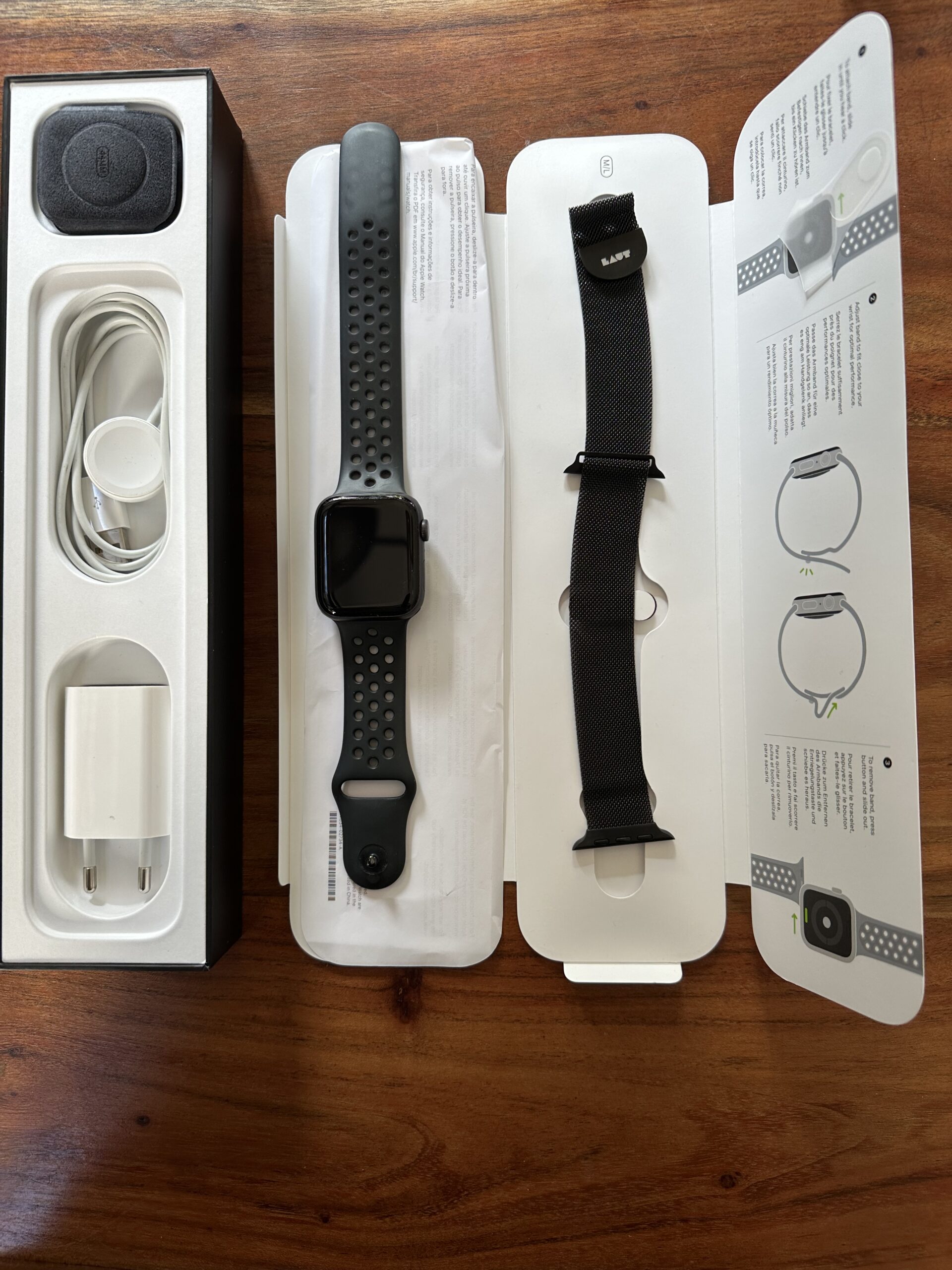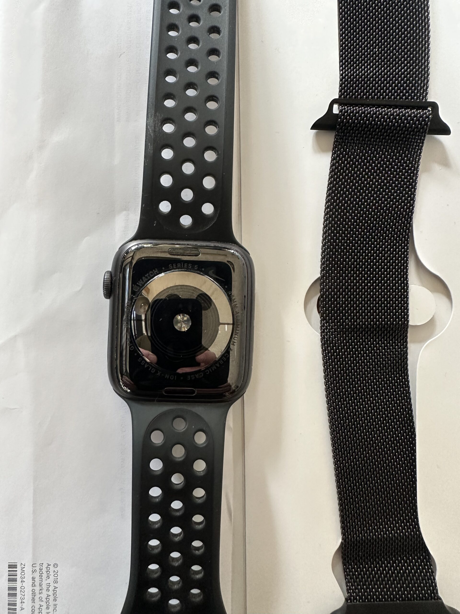 Prodám Apple Watch 5 44 mm v bezvadném stavu s Nike řemínkem + nový nepoužitý řemínek “milánský tah” – černý