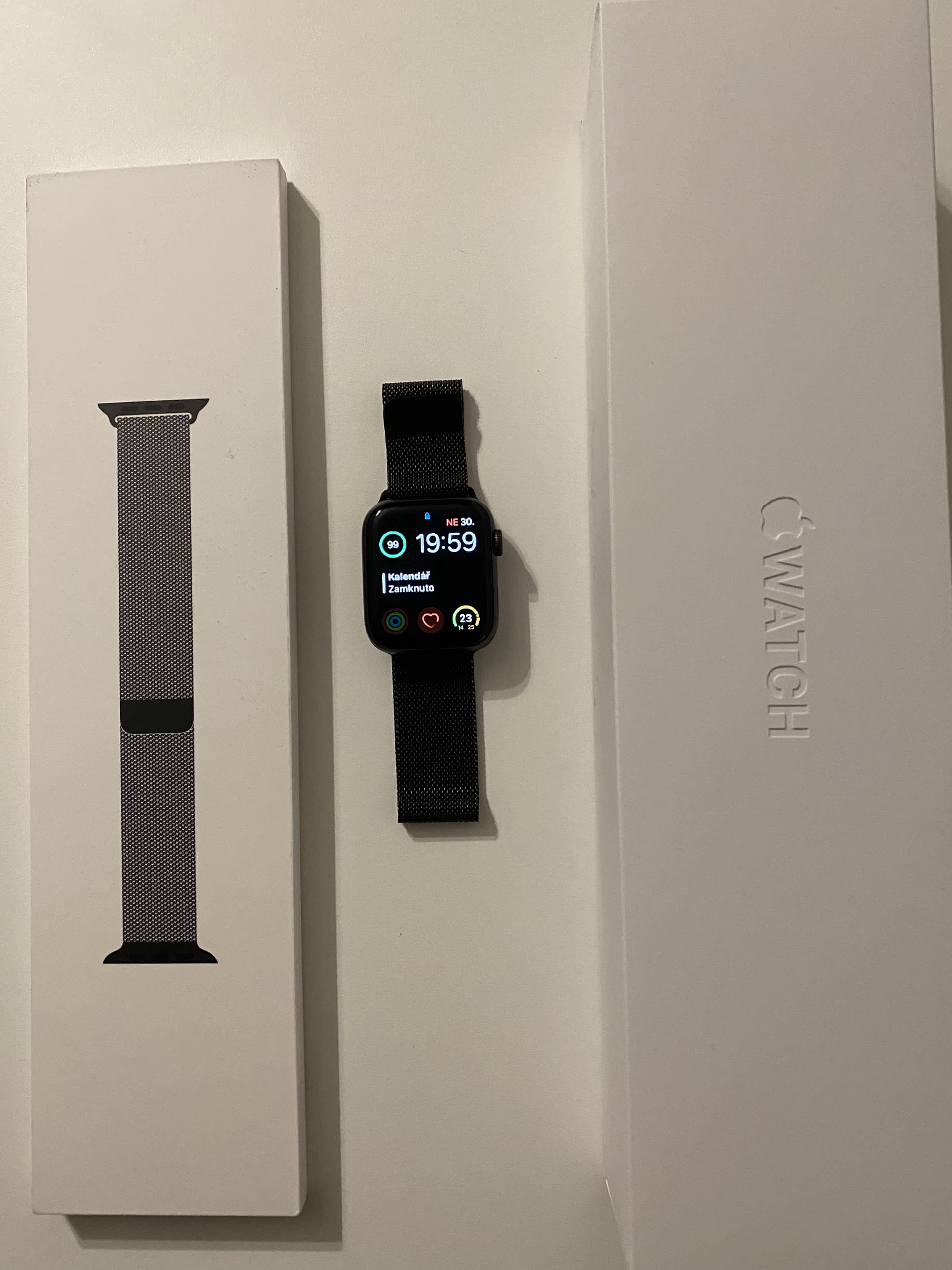 Nabízím k prodeji Apple Watch 5 s Milánským tahem (+ originálním silikonovým řemínkem), kupovány 05/2020 v Alze.