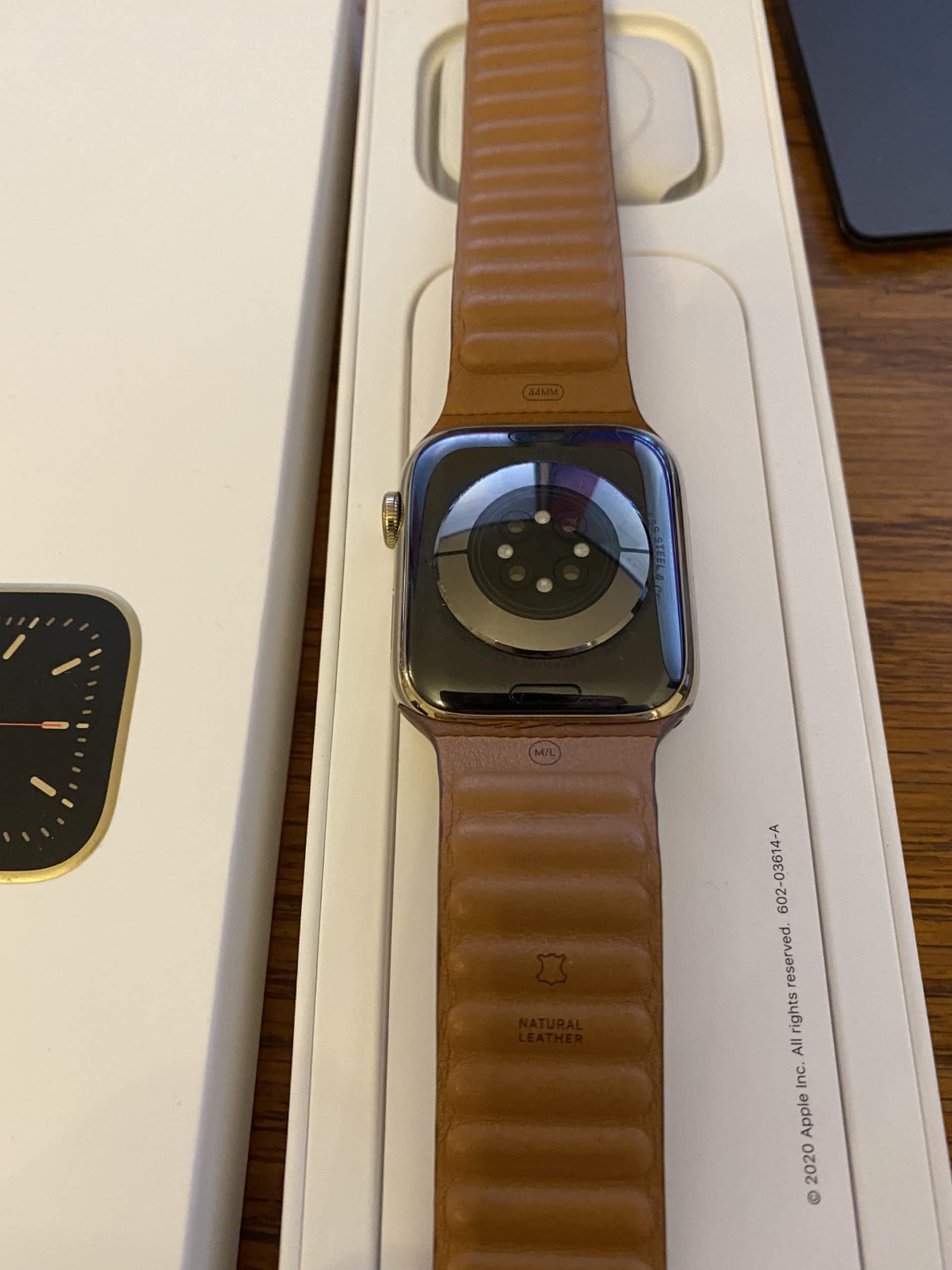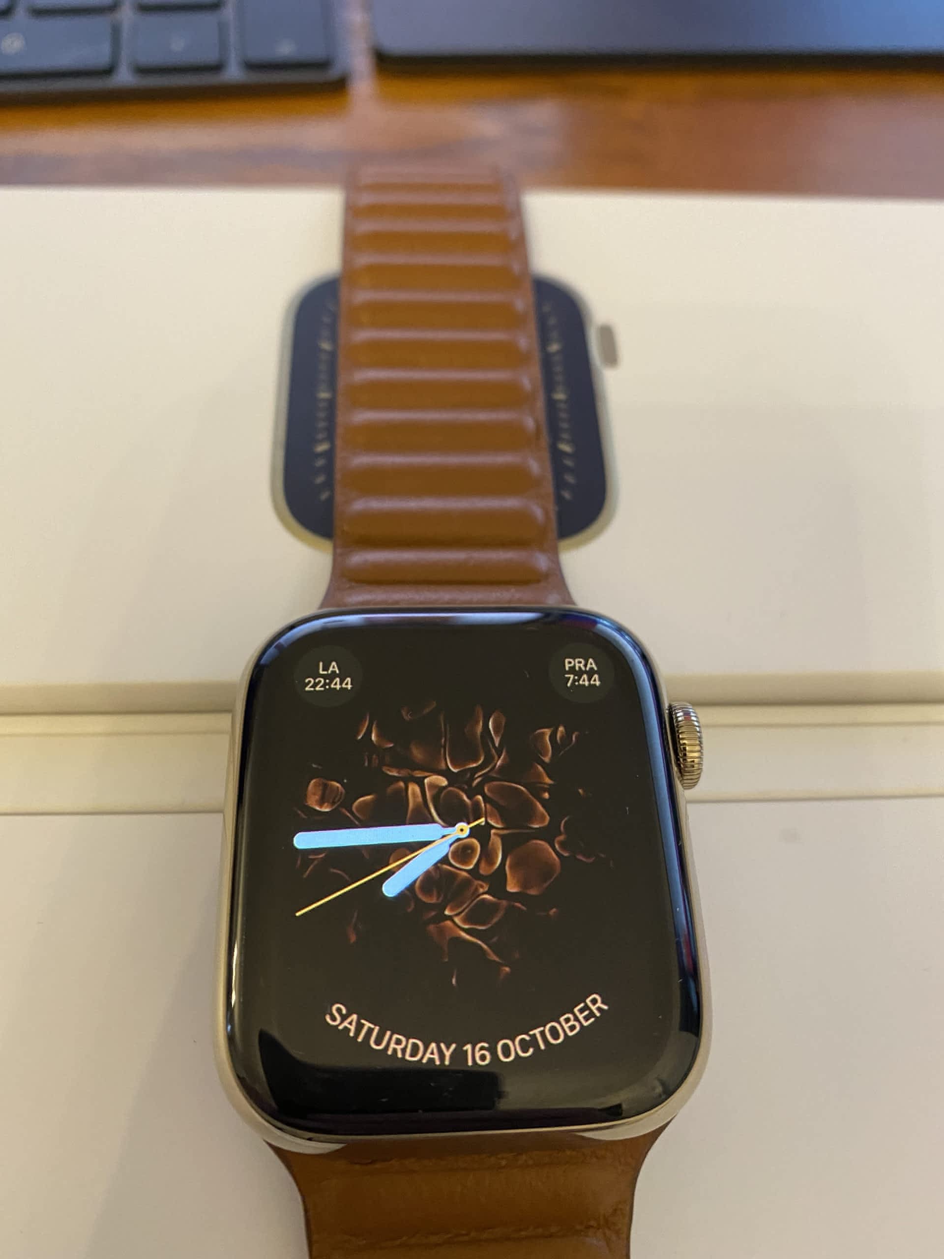 Téměř nepoužité Apple Watch series 6 Cellular GPS 44mm zlatá ocel se zlatým milánským tahem. Kupované 16.06.2021 na apple.cz. Důvod prodeje: Mám nové series 7