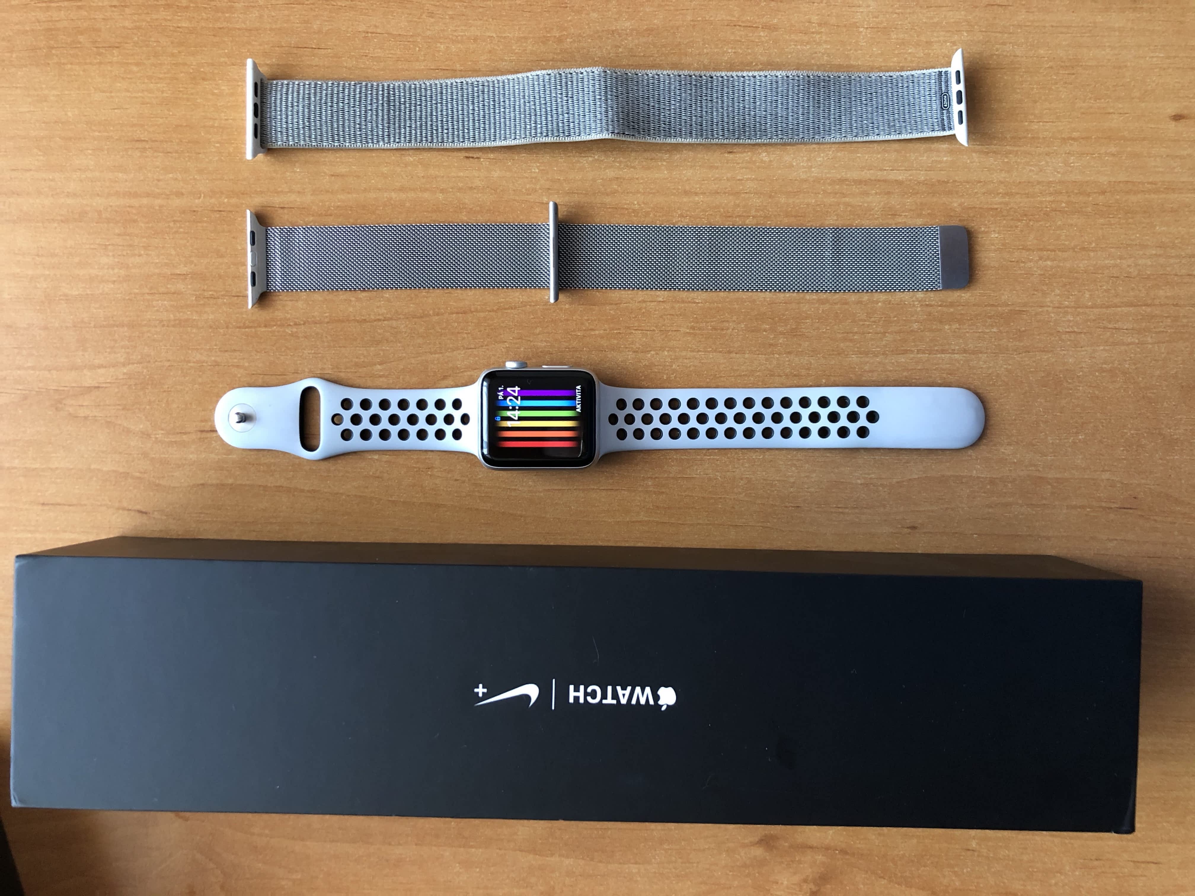 Prodám Apple Watch Nike+ (serie2) 40mm. Běžné opotřebení. Standardní balení + silver milánský tah + šedý sportovní Nike provlékací řemínek + oranžový sportovní Nike provlékací řemínek.