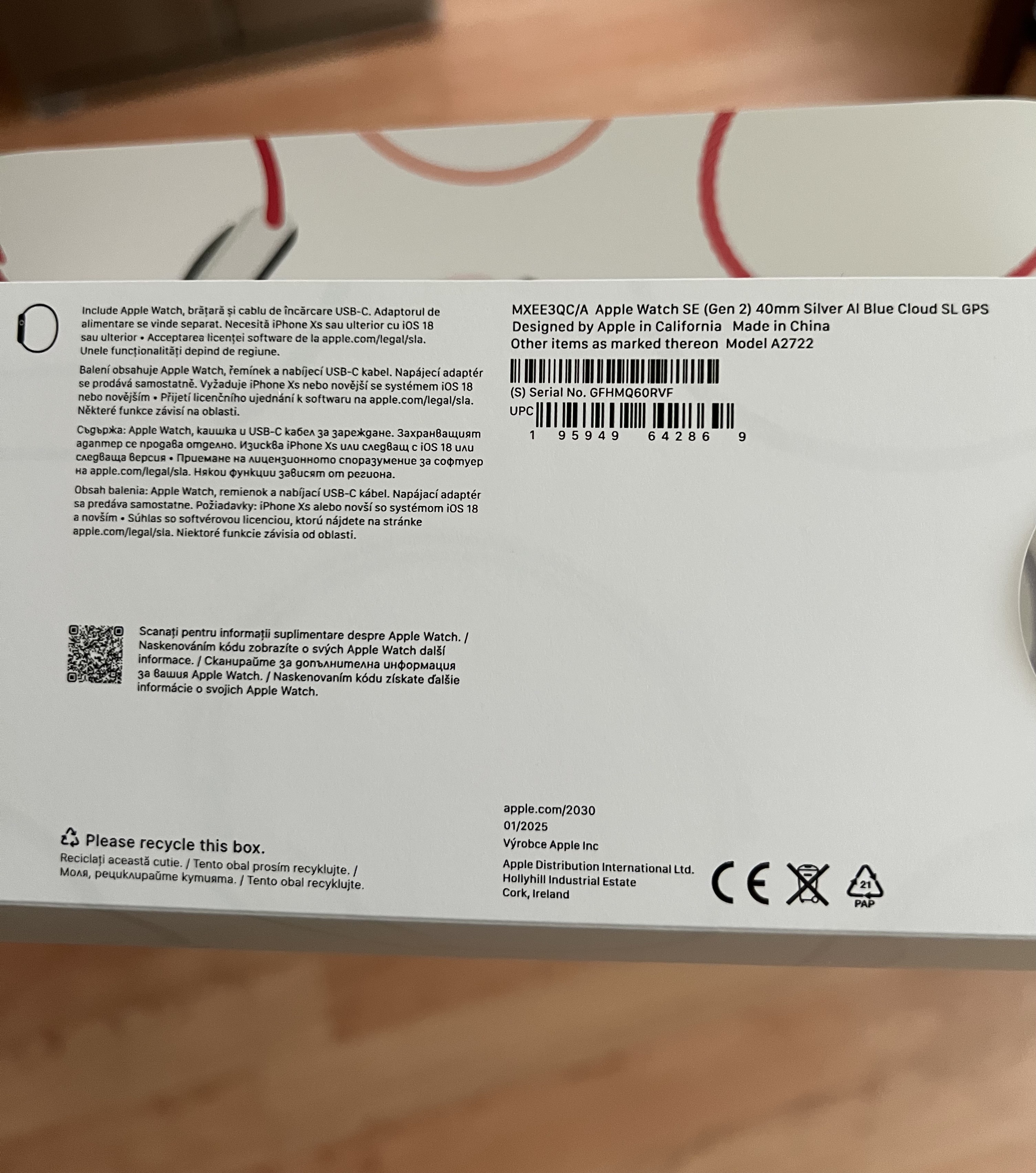 Hodinky nošené cca měsíc. Drobné oděrky na displeji. Kondice baterie 100%. Sportovní světle modrý pásek jé nepoužitý, v neporušeném balení. Součástí je nabíječka s konektorem USB-C.
