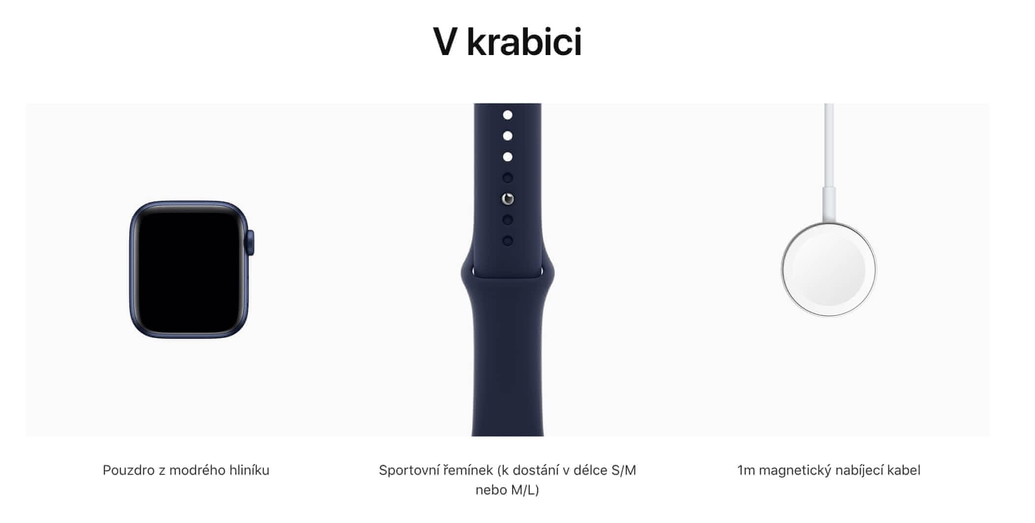 V balení hodinky, řemínek, dobíjecí kabel.