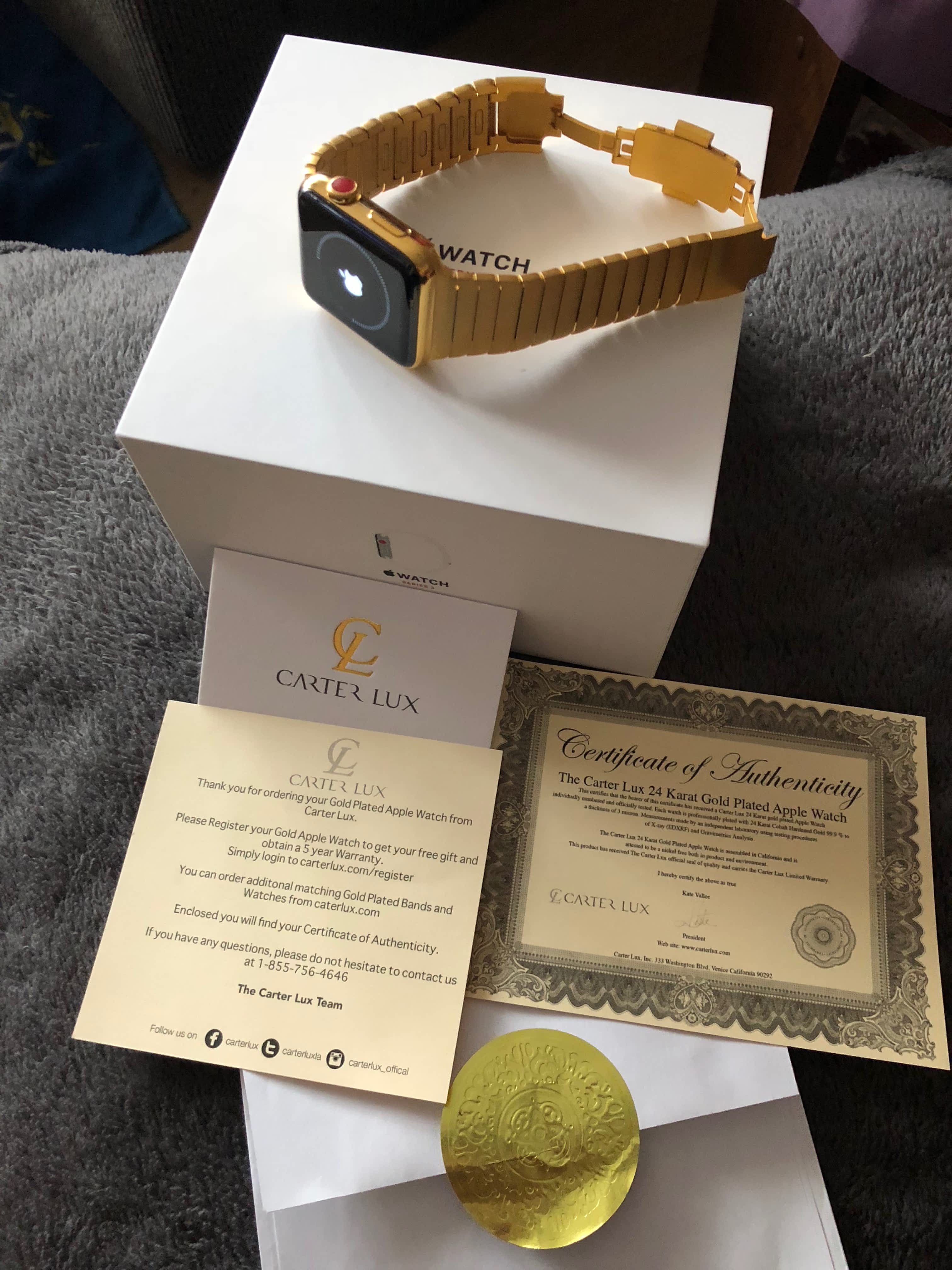 Prodám hodinky iWatch 42mm Series 3 celopozlacené 24karátovým zlatem, firma Carter Lux. Původní cena 2000 USD. Nošeno 1měsíc, původní balení včetně certifikátu autentičnosti a dokladu o koupi k dispozici. Zaregistrované se zárukou 5 let. Cena dohodou.
