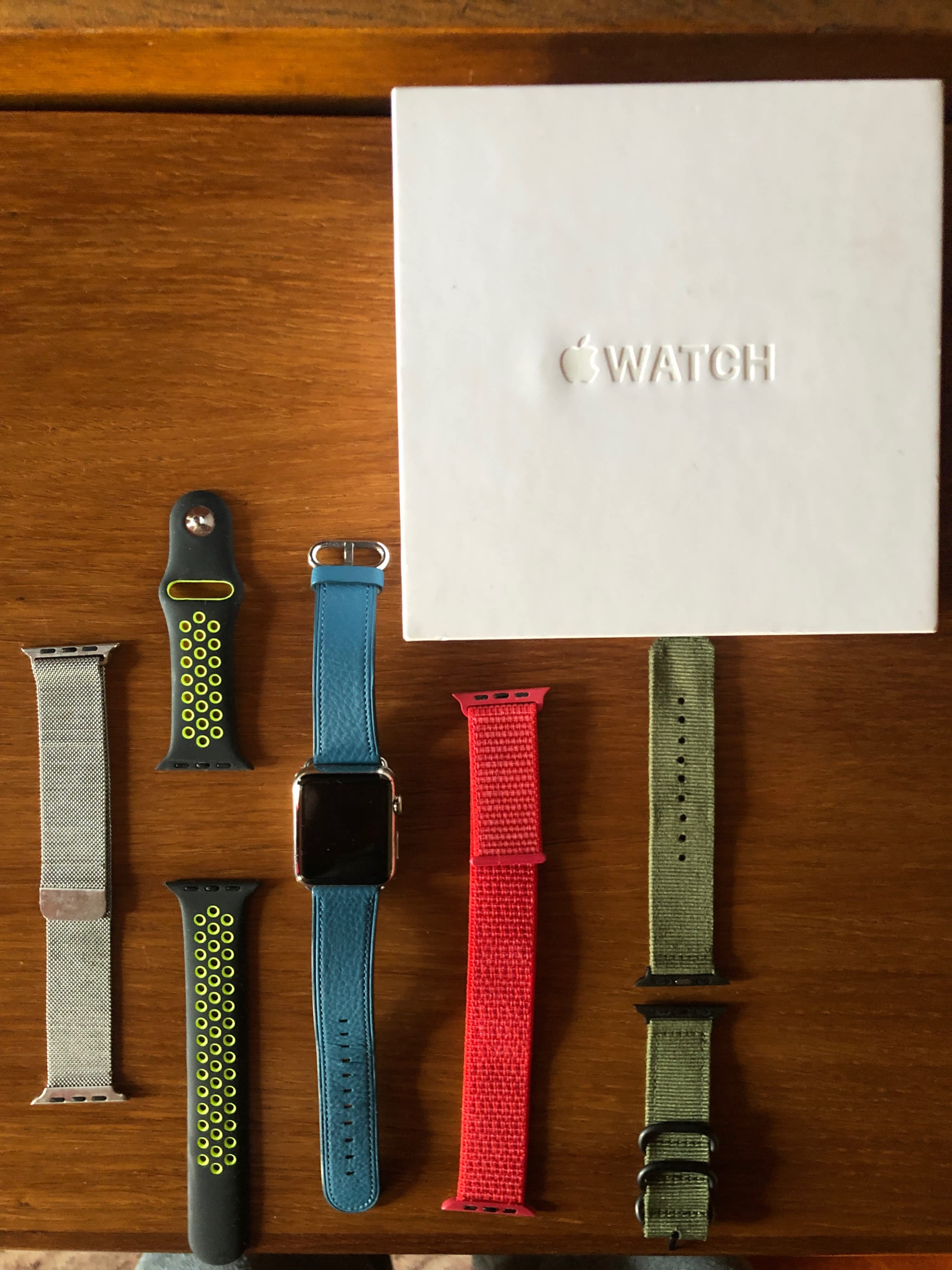 Dále jsou ještě tři řemínky kde každý stál kolem 200kč. taky jako nové, za zmínku stojí i to že je v Apple watch měněná baterie , která má za sebou pouze pár nabíjecích cyklů, doklad o výměně v kvalitním servisu,doklad bude přiložen, cena výměna 1500kč . Dále také hodinky obsahují kompletní balení , včetně nabíječky, manuálu, plastovou krabičku a papírovou krabičku. Jako bonus k hodinkám přidám i dva nabíjecí stojánky jeden čistě na Apple Watch a druhý kombinovaný kde se dají usadit jak Apple Watch, iPhone tak také Airpody. Foto na vyžádání. Pokud budete mít nějaké dotazy, klidně se ptejte 🙂 Vhodné použít jako dárek nebo jako vstupní model nebo popřípadě do sbírky, to už je na každém pro co se rozhodne 🙂 Ještě doplním že všechny funkce Apple Watch jsou plně funční (měření tepu, Apple Pay atp.. )