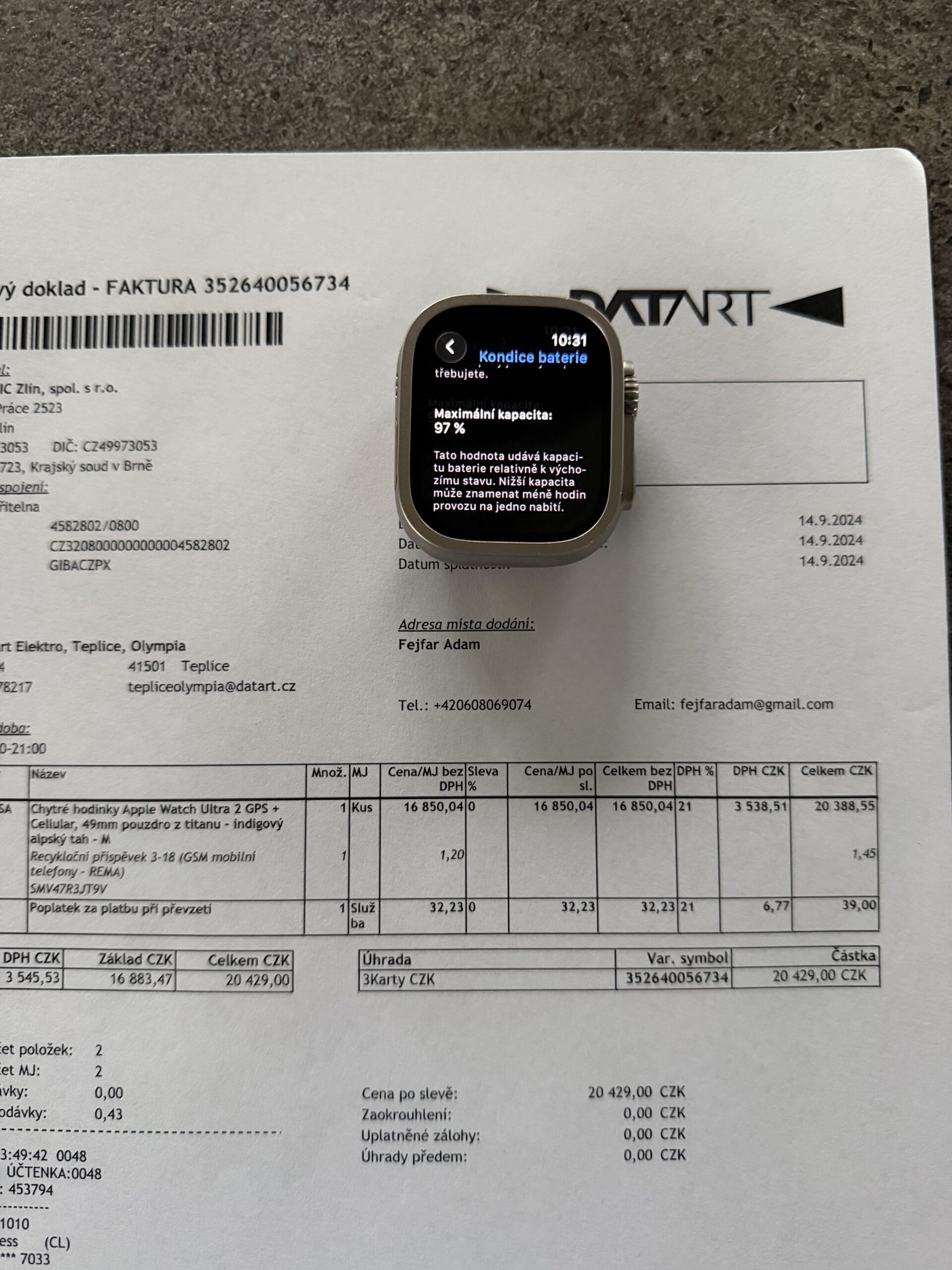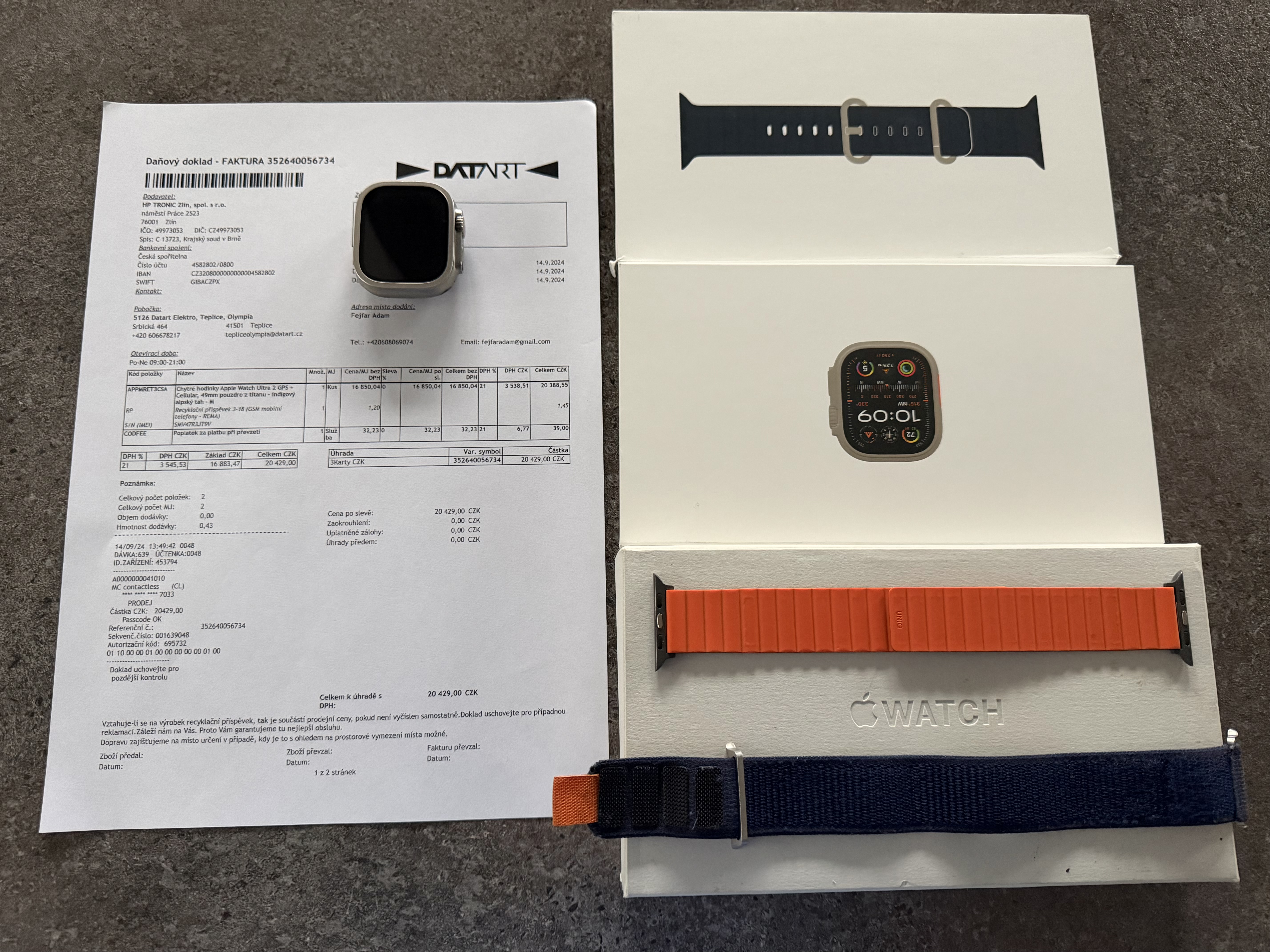 Prodam chytre hodinky apple watch ultra 2 serie,super stav,vzdy noseny s ochrannym rameckem a krycim sklem na displeji.Kompletni baleni s nabijeckou a 2 řeminky.Doklad o koupi z datartu se zarukou do 14.9.2026.Kapacita baterie 97%