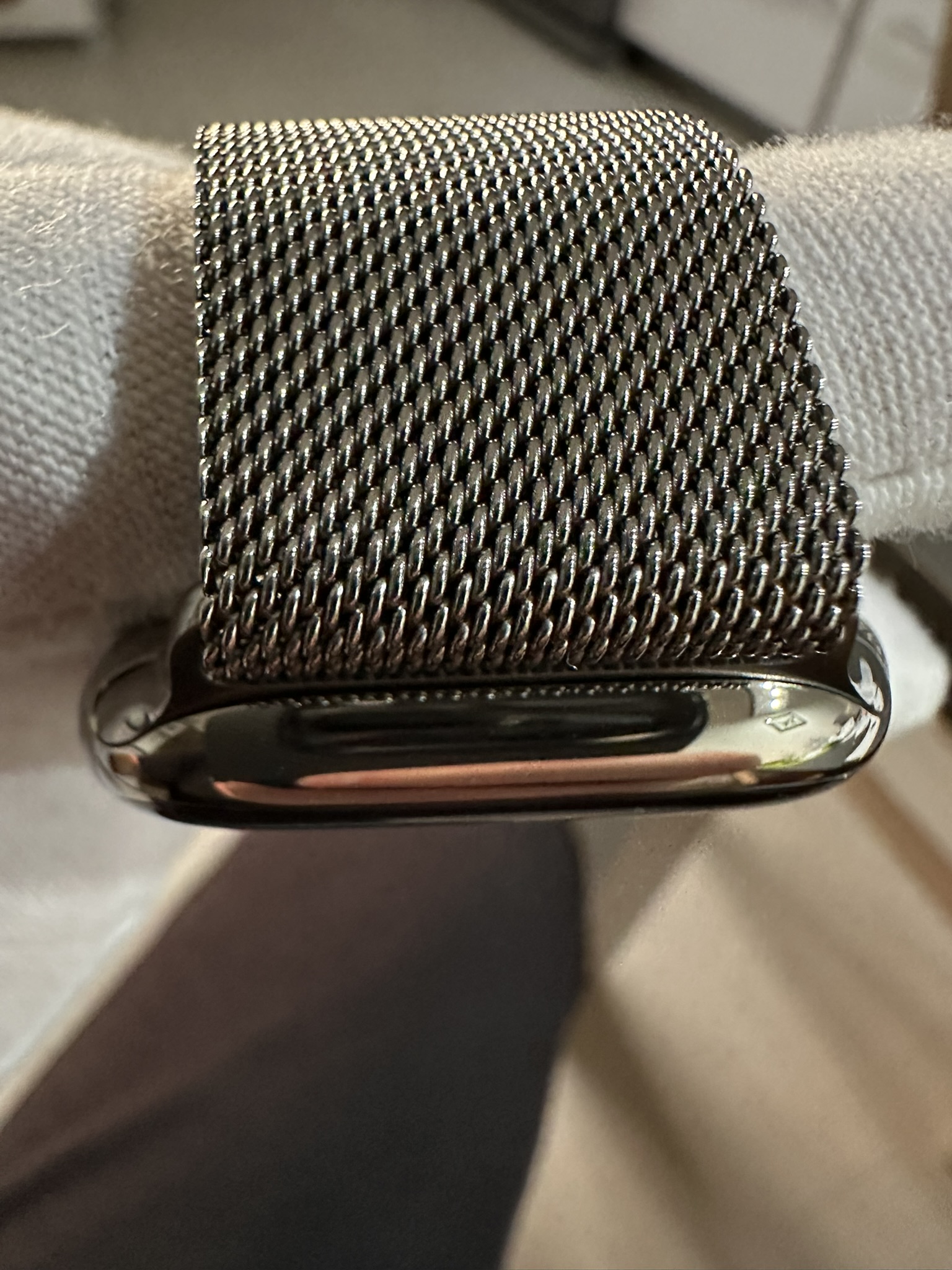 Stav Velmi dobrý! Hodinky byli nošené v odolném krytu. Bez stop škrábanců na tělu hodinek. Mírné odřeniny jsou na magnetickém zamykacím systému na konci řemínku.