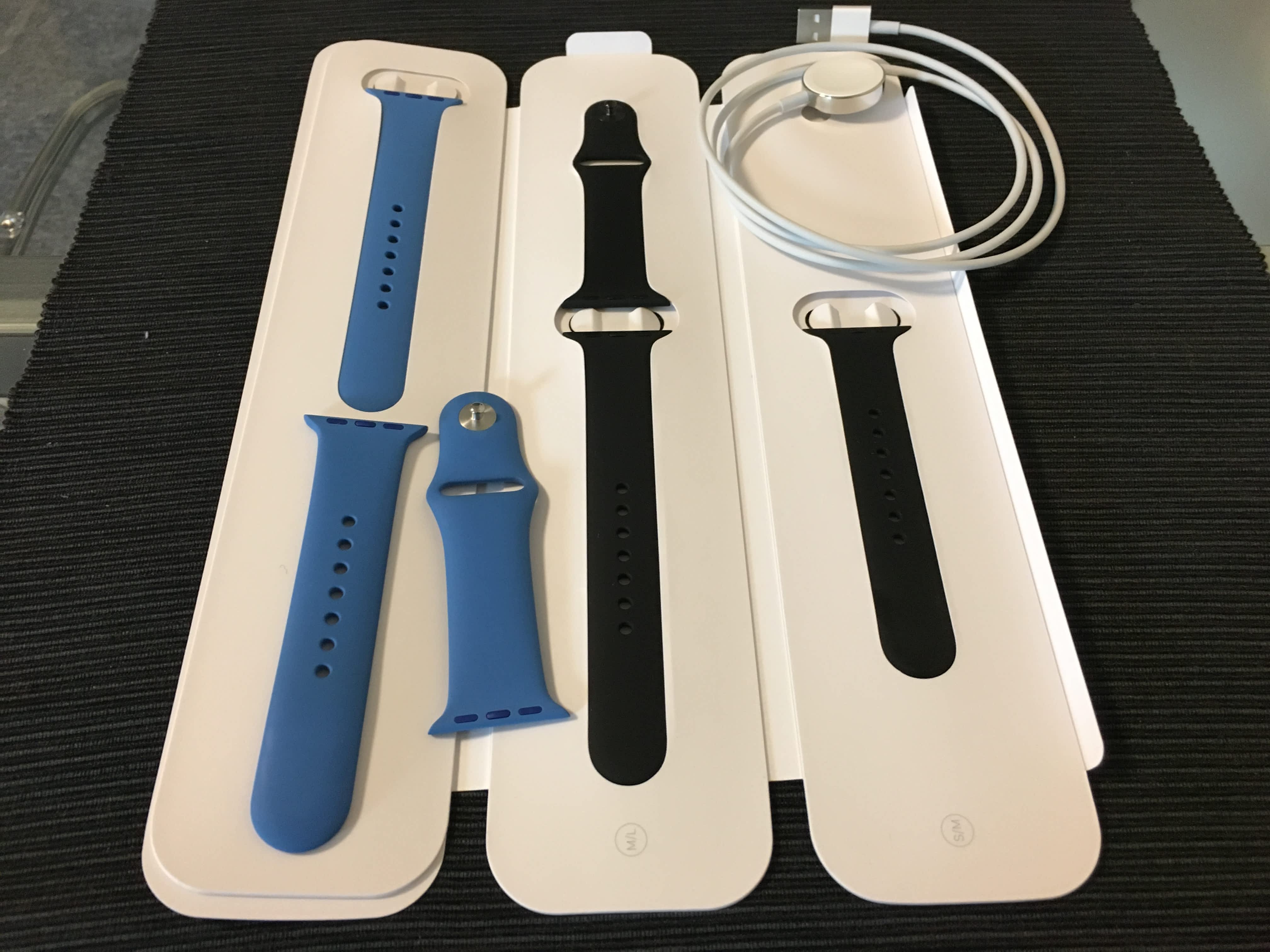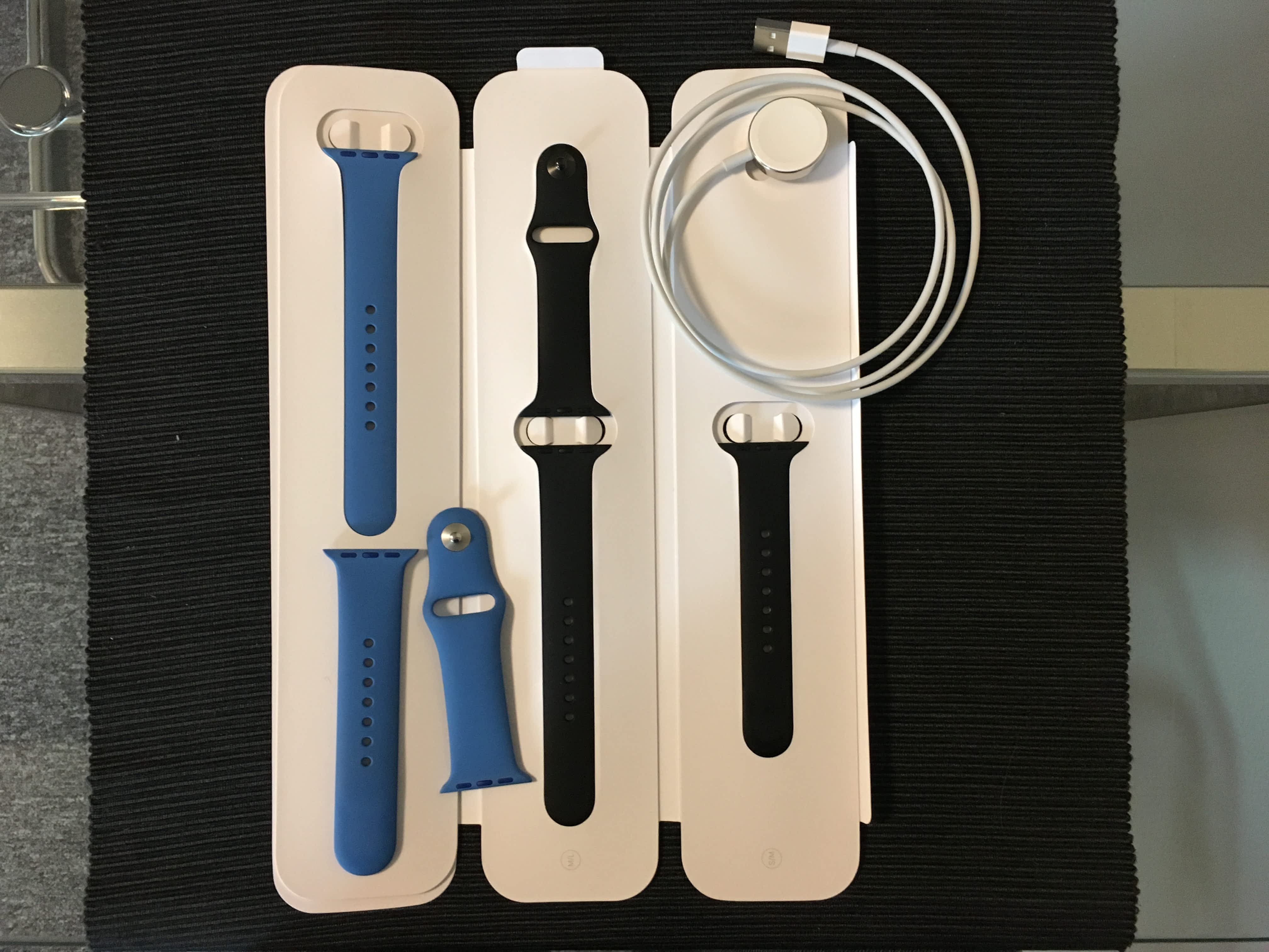Prodam dva silikonove reminky na Apple Watch 38mm a k tomu USB kabel.