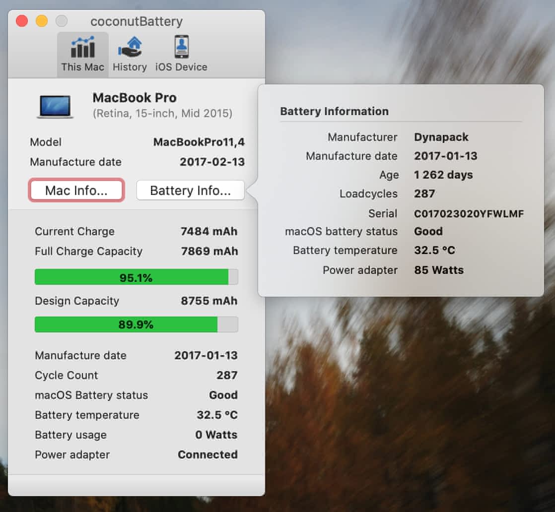 Baterie je ve skvělé kondici s 90% kapacitou a 287 cykly. Má MacOS Catalinu.