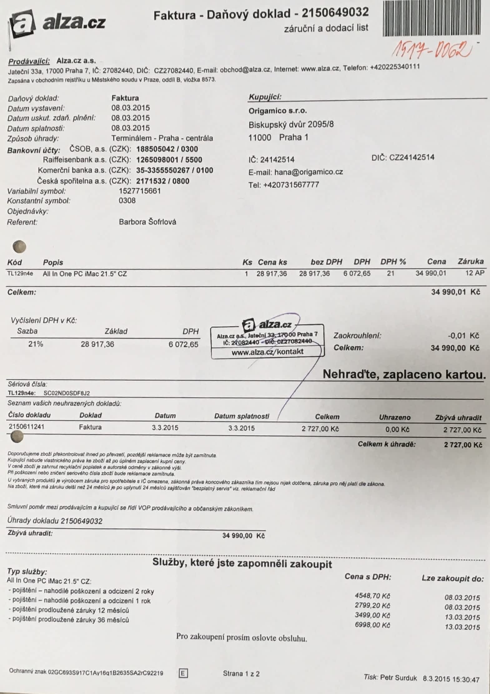 iMac 21,5, procesor i5 2.7GHz, 8GB paměť, 1TB disk, grafika 2.7GHz Intel Iris Pro. Koupený 8. 3. 2015 v Alza, původní cena 34 990, faktura k dispozici. Plně funkční. Technické specifikace: http://apple.co/2iIGJ3J