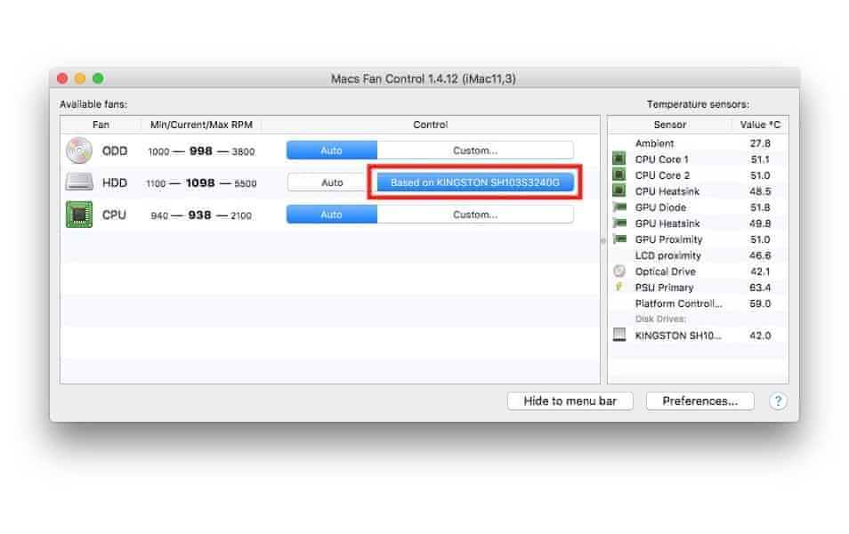 SSD disk byl montován dodatečně a neumí sám do operačního systému reportovat teplotu, což způsobuje roztočení větráčků v počítači. Není to ale žádný problém, stačí používat jakoukoliv utilitu na regulaci otáček ventilátoru (např. Macs Fan Control) a v té zdroj teploty přepnout ručně (viz obrázek).