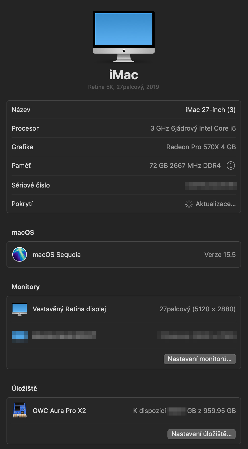 – 72GB 2666 MHz RAM DDR 4. Původně 8GB (2x 4GB). Dokoupeno 64GB (2x 32GB).