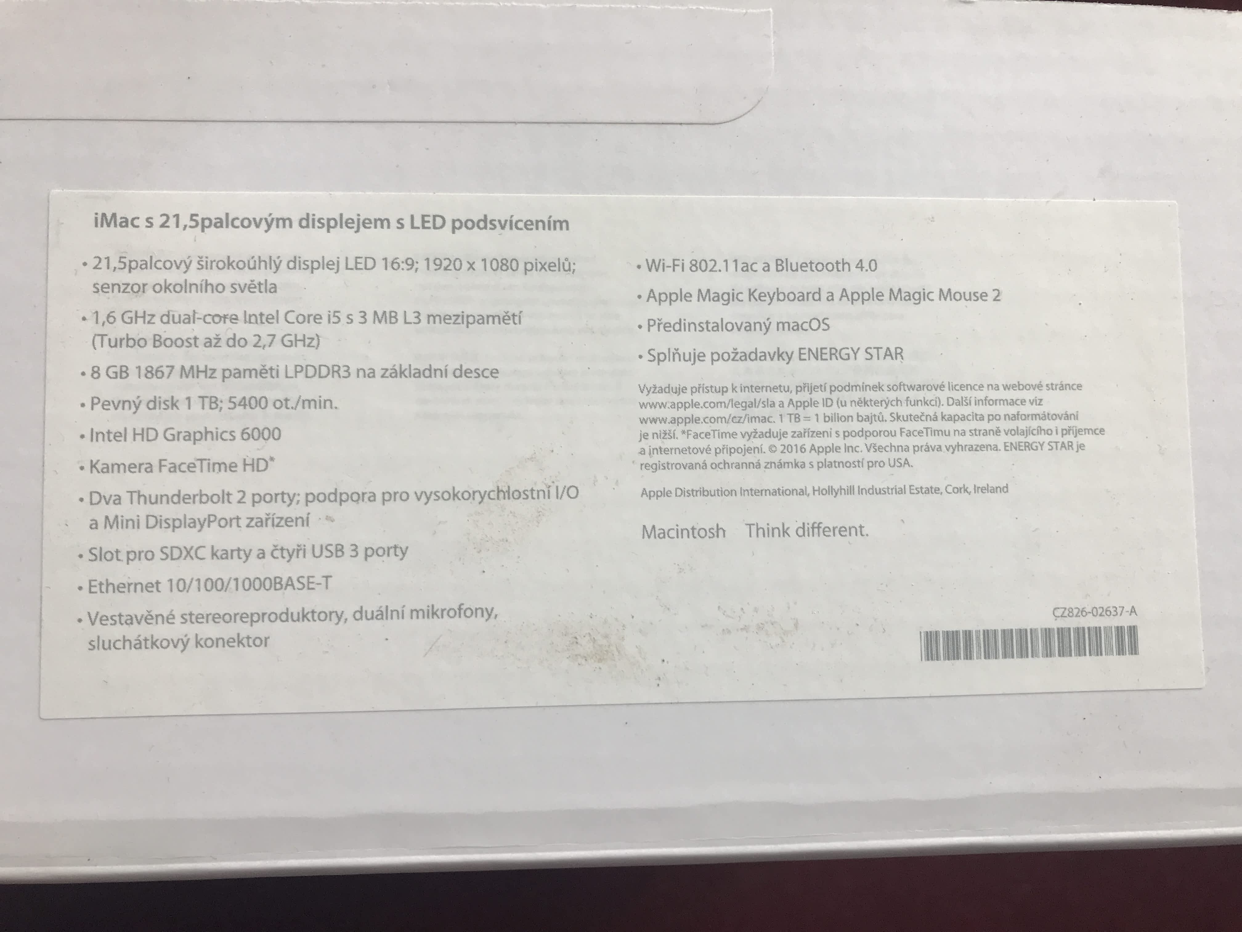 iMAC 21.5" +20 měsíců záruka iMac 21.5" se zárukou 20 měsíců Vstup USB 4x, Bluethooth, Webová kamera,Wi-fi,procesor – Intel Core i5, Kapacita paměti 8GB, balení obsahuje napájecí kabel, klávesnici bezdrátovou + myš iMac byl zakoupen 4.5.2017 na Alze.cz Důvod prodeje – z důvodu koupě Macbooku, pro asistenta. Potřebovali jsme přenosný počítač, ale z počátku byla představa jiná a vhodný byl iMAC.