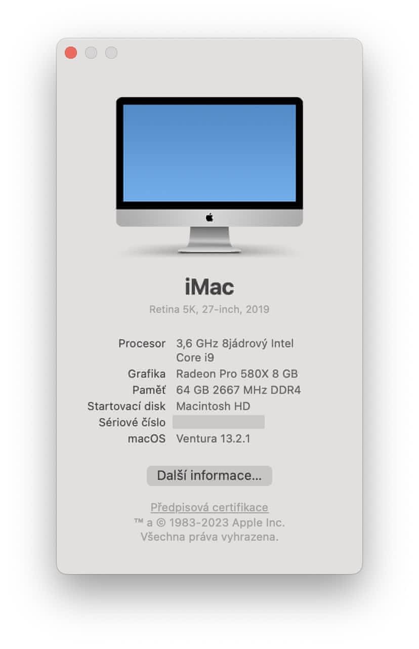 tech. spec.: iMac 5K, 27 palců, 2019, i9 (3,6 GHz, 8 jader), 64 GB RAM, VRAM 8 GB, 1 TB SSD