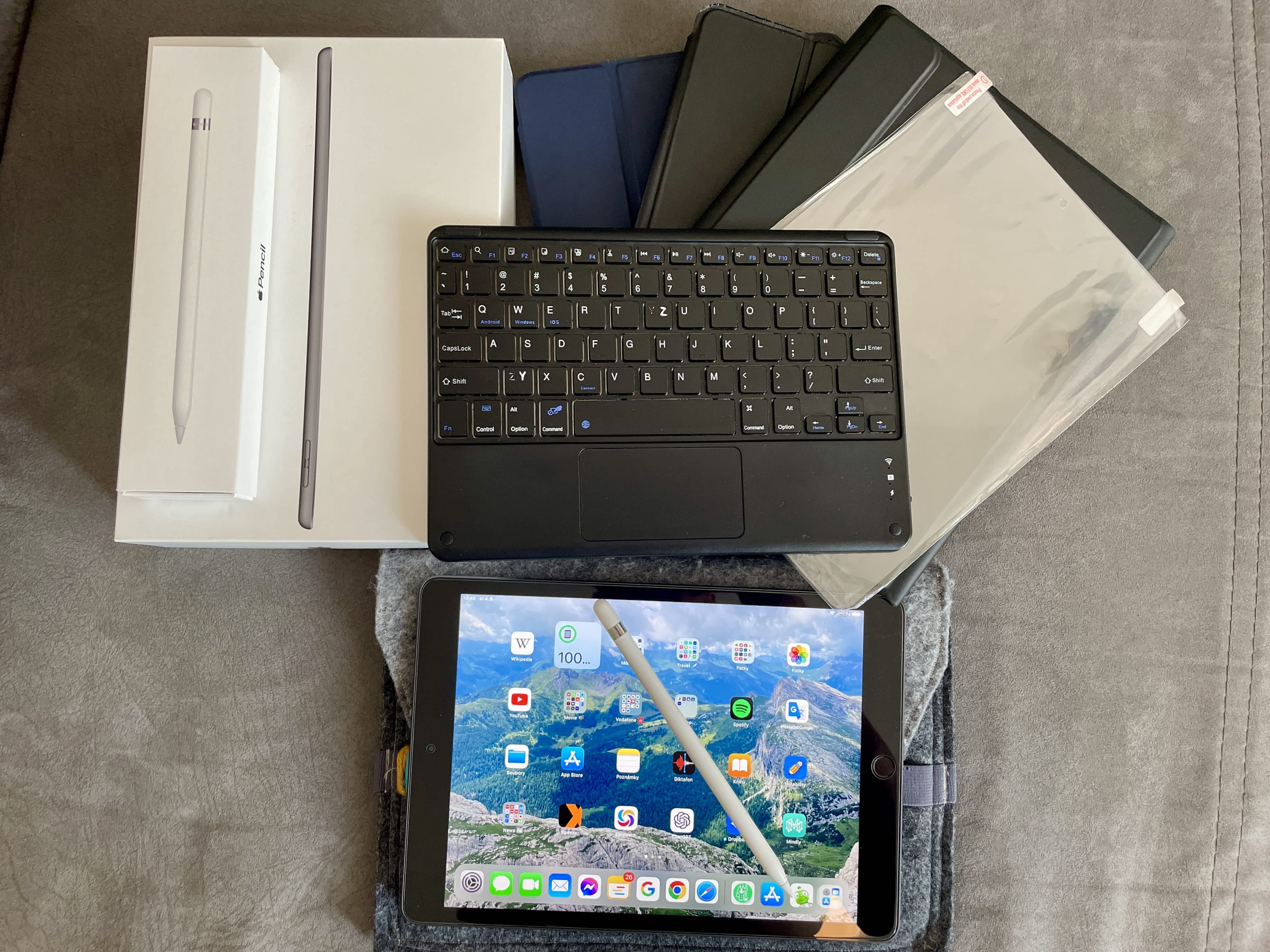 Součást prodeje: iPad, Pencil, Originální krabice, nabíjecí kabel s koncovkou do zásuvky, 3x pouzdro, 1x klávesnice, náhradní ochranná fólie.