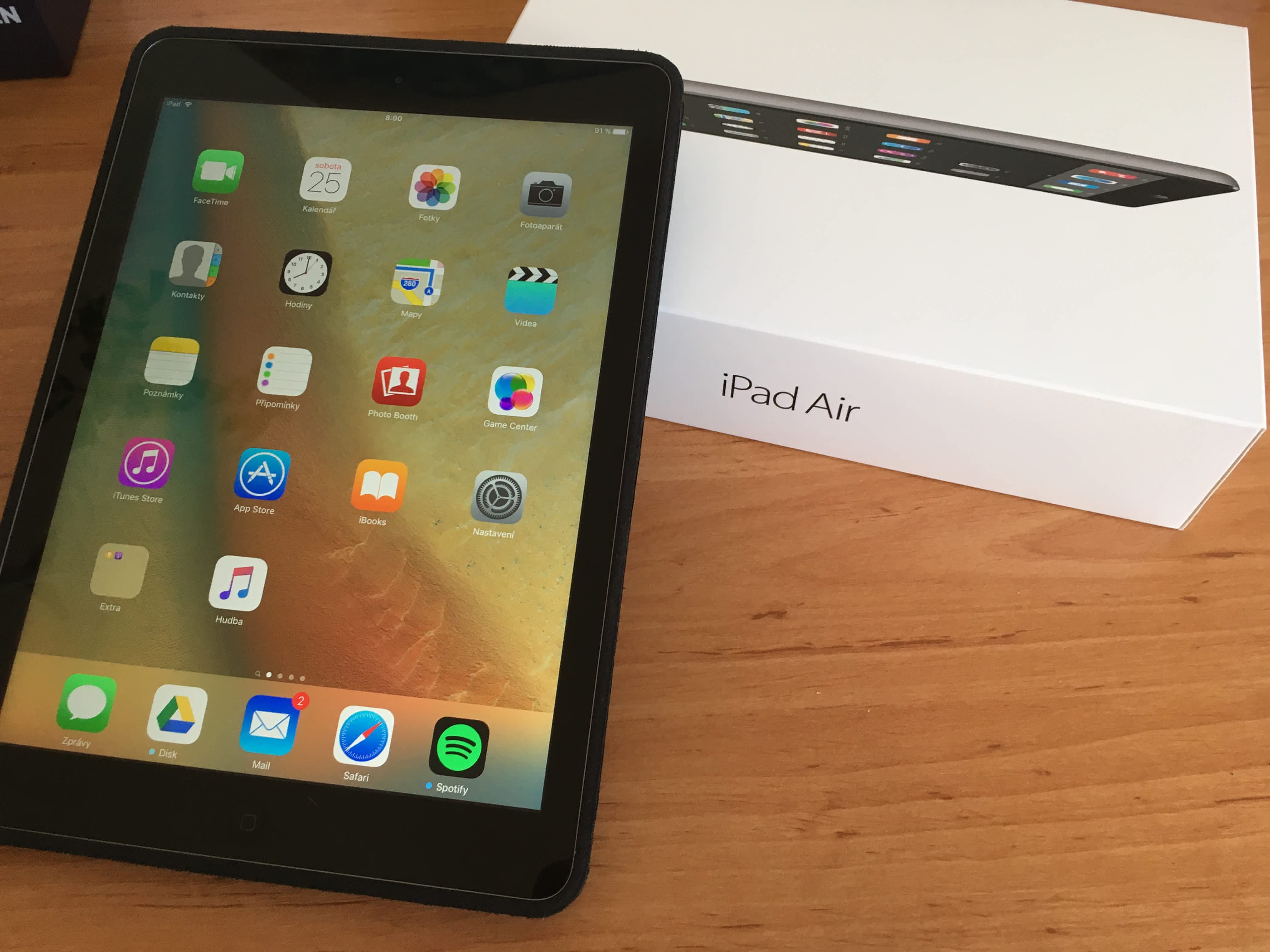 nabizim Apple iPad Air 16 GB Space Black. Tablet je malo pouzivany, v perfektnim stavu – bez jakyhkoliv skrabancu, s kompletnim originalnim prislusenstvim, krabici, zarucnim listem do ledna 2018, cernym obalem na cely pristroj. Aktualne je nainstalovany iOS9.